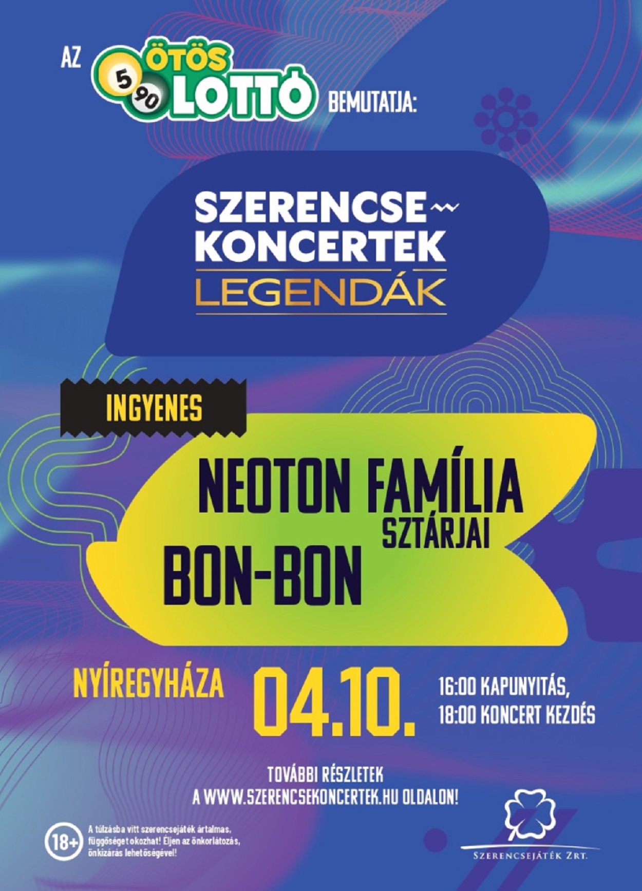 Nyíregyháza főterén, adnak ma este ingyenes koncertet a Bon Bon és a Neoton Família Sztárjai. A Szerencsekoncertek elnevezésű országos turné keretében megvalósuló eseményen a kapukat délután 16 órakor nyitják meg a közönség előtt. A program 18 órakor a Bon Bon fellépésével indul, majd 19 óra 15 perctől a Neoton Família Sztárjai lépnek színpadra. Az esemény ideje alatt a belvárosban forgalomkorlátozásokra és megnövekedett gyalogosforgalomra kell számítani, a rendezvény látogatása mindenki számára ingyenes.