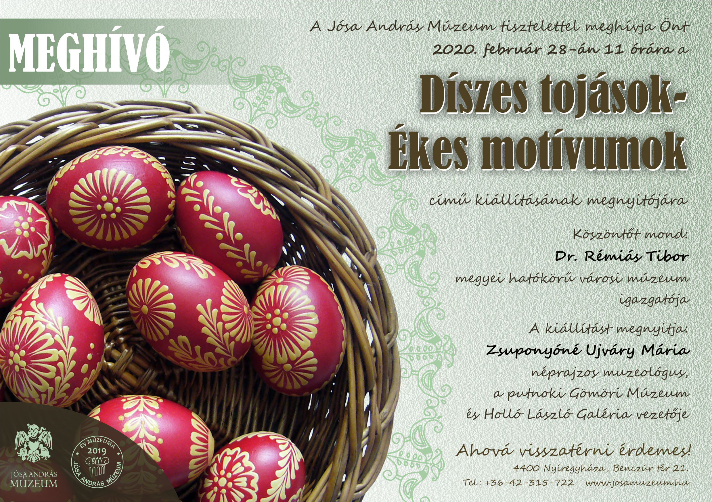 A húsvét közeledtével Díszes tojások - ékes motívumok címmel időszaki kiállítás nyílik a Jósa András Múzeumban február 28-án, pénteken 11 órától. Az igazi családi programnak ígérkező tárlat számos technikával készült hímestojást mutat be. Rémiás Tibor, a Jósa András Múzeum igazgatója azt is elárulta rádiónknak, hogy akár mi magunk is készíthetünk majd hímestojást.