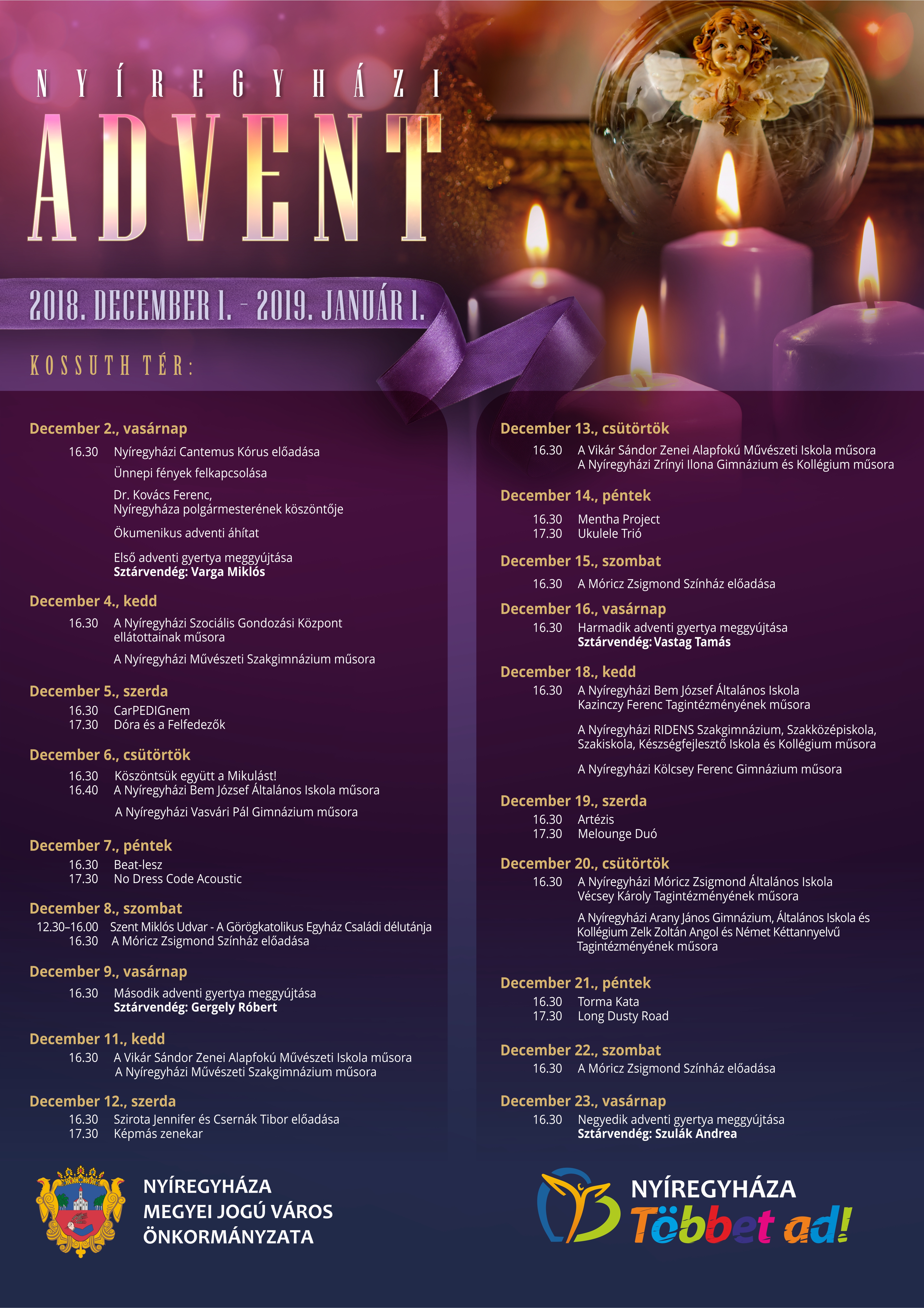 Az önkormányzat mindenkit szeretettel vár az adventi programokra. December 9-én (vasárnap) 16.30 órakor Dr. Ulrich Attila alpolgármester gyújtja meg a második gyertyát a város adventi koszorúján. Az est sztárvendége Gergely Róbert. Majd december 10-e hétfő kivételével, a hét minden napján 16.30 órától remek programokkal hangolódhatunk a közelgő ünnepre.