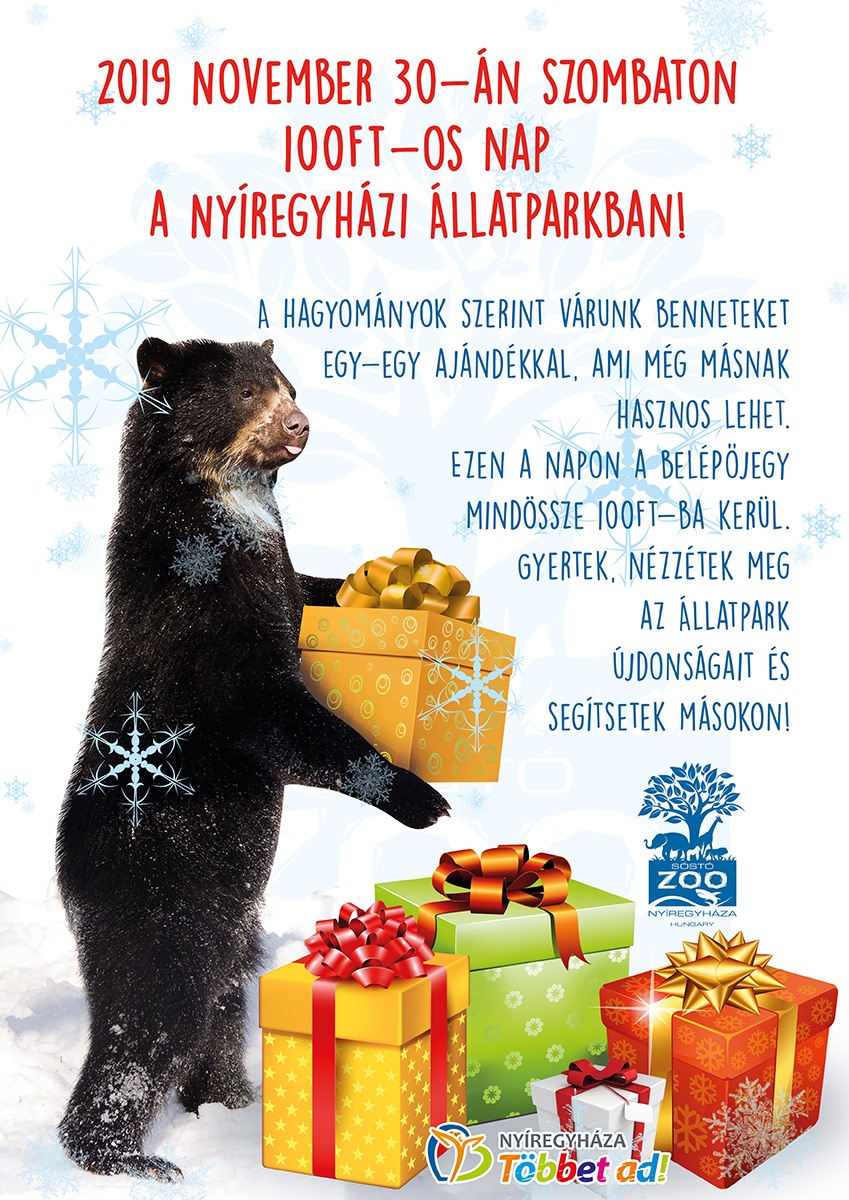 A Nyíregyházi Állatpark idén is megrendezi a hatalmas népszerűségnek örvendő 100Ft-os napját november 30-án, szombaton. A szervezők annyit kérnek csupán, hogy aki megteheti, hozzon magával egy ajándékot. Tartós élelmiszereket, tisztítószereket, higiéniás termékeket, játékokat, könyveket várnak. Kérnek mindenkit, hogy ezen a különleges napon ne SZÉP kártyával és bankkártyával fizessenek. Az lenne a legegyszerűbb, ha a látogatók 100Ft-os érmével érkeznének. A Nyíregyházi Állatpark oktatási osztály