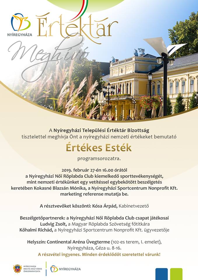 Folytatódik városunkban a nyíregyházi nemzeti értékeket bemutató Értékes Esték programsorozat, február 27-én, szerdán 16.00 órától, a Continental Arénaban. Az eseményen a Nyíregyházi Női Röplabda Club kiemelkedő sporttevékenységét, mint nemzeti értékünket egy vetítéssel egybekötött beszélgetés keretében Kokasné Blazsán Mónika, a Nyíregyházi Sportcentrum Nonprofit Kft. marketing referense mutatja be. Beszélgető partnerek: a csapat játékosai, Ludvig Zsolt, a Magyar Röplabda Szövetség főtitkára és
