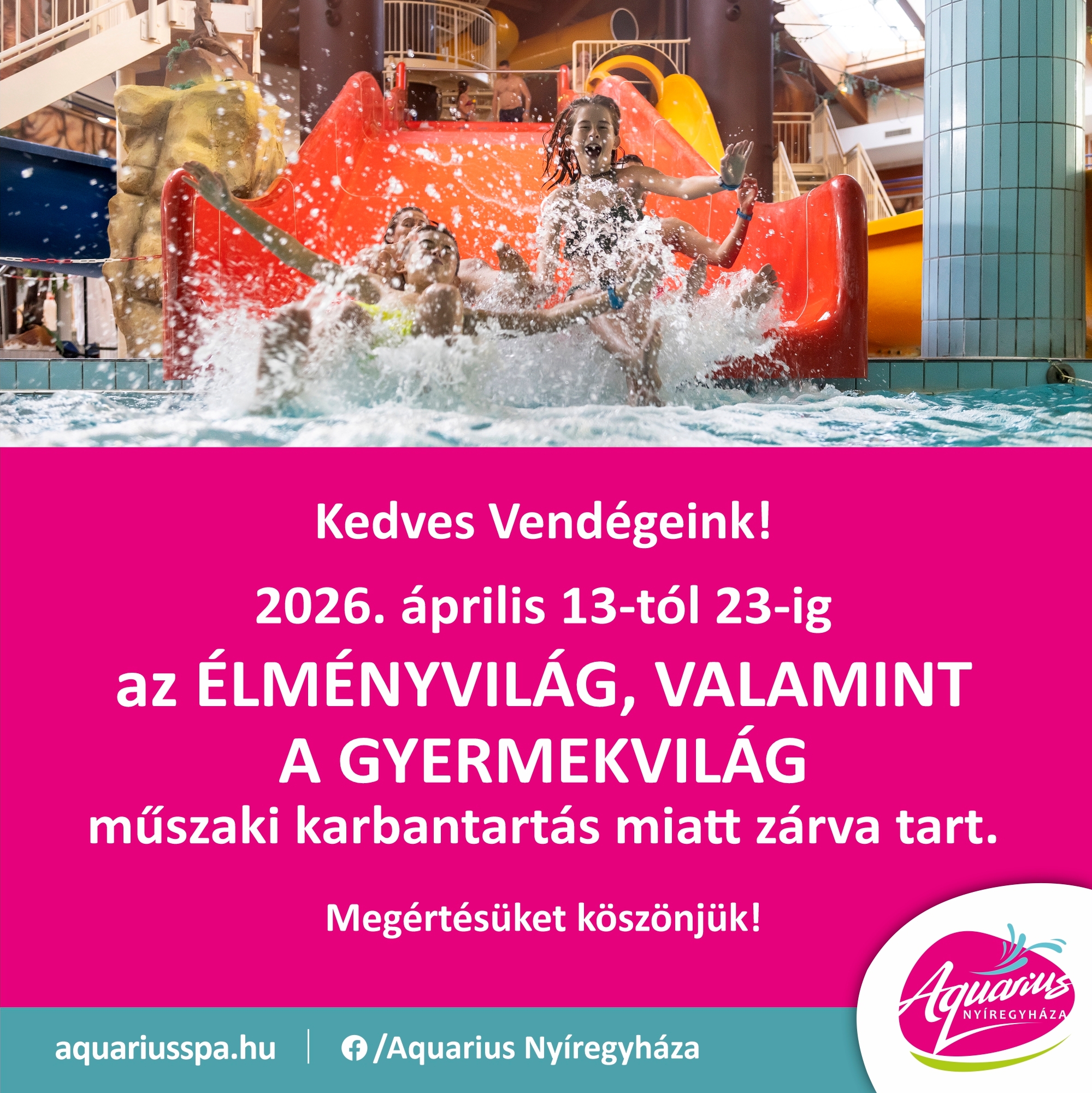 Műszaki karbantartás miatt április 13-tól 23-ig zárva tart a nyíregyházi Aquarius Élményfürdő élmény- és gyermekvilága. A munkálatok idején a fürdő ezen részlegei nem látogathatók, de a nyitás után megújult környezetben várják vissza a csobbanni vágyókat. A vezetőség a vendégek megértését kéri a tíz napig tartó üzemszünet miatt, amely a biztonságos és színvonalas kikapcsolódást szolgálja. További részleteket az aquariusspa.hu oldalon vagy a fürdő közösségi felületein találhatnak az érdeklődők.