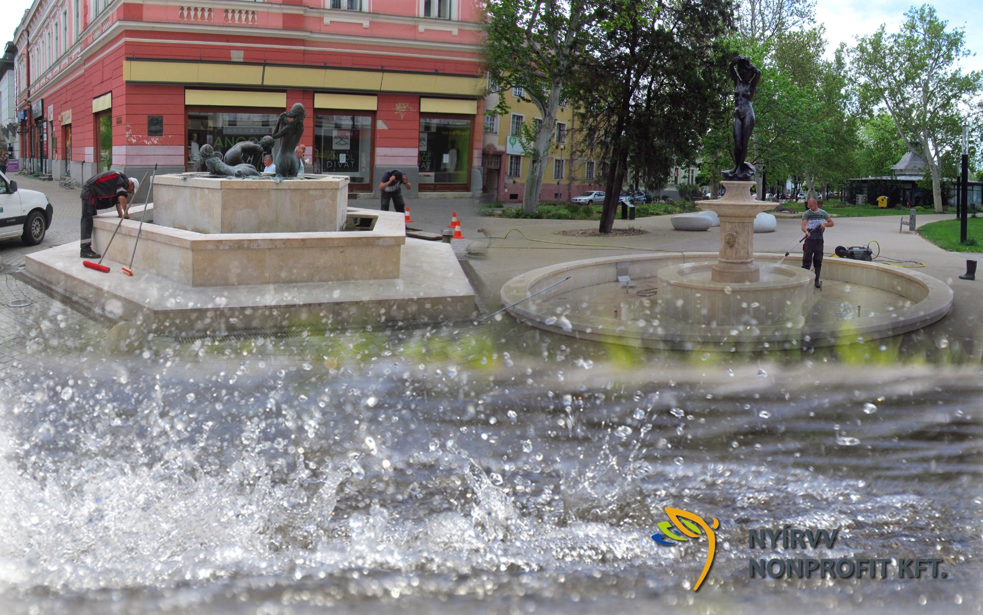 Folytatódnak a múlt héten megkezdett szökőkút tisztítási és karbantartási munkálatok is városunkban. A NYÍRVV Nonprofit Kft. munkatársai kijavítják a szökőkutak burkolatában jelentkező, technikai jellegű hibákat, alapos tisztítást végeznek, és elkezdik a feltöltési munkákat, hogy a hét végére ismét teljes pompájában tündököljön Nyíregyháza számos szökőkútja.