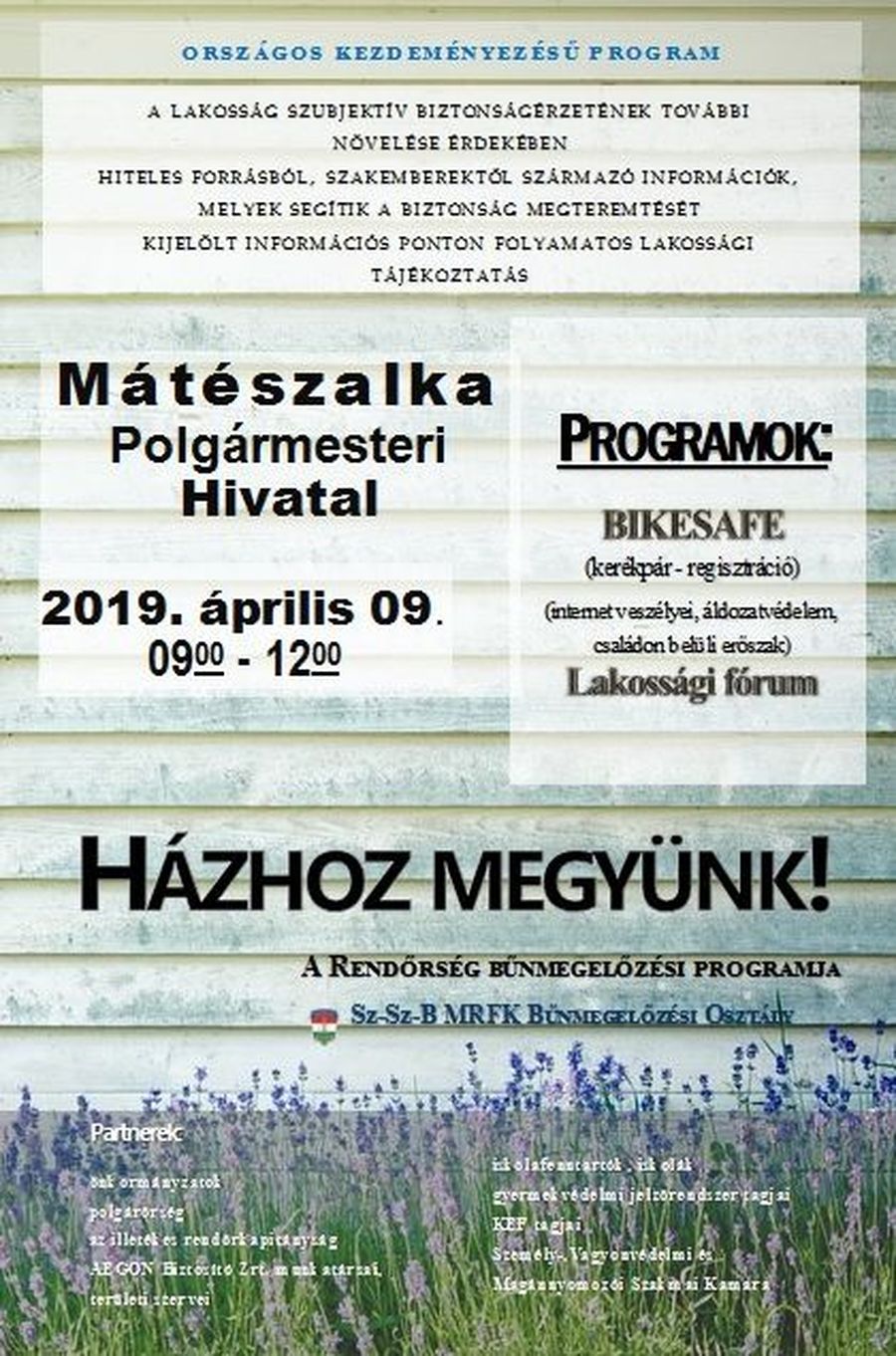 A rendőrség a 2015 őszén útjára indított „Házhoz megyünk” elnevezésű országos kampánysorozatot idén is folytatja. A fő cél, hogy szakemberektől származó információk közreadásával a rendőrség segítse a közbiztonság növelését és javítsa az állampolgárok önvédelmi képességét. A Megyei Rendőr-főkapitányság munkatársai a prevenciós programmal legközelebb április 9-én, kedden 9 és 12 óra között, Mátészalkán, a Polgármesteri Hivatalnál várják az érdeklődőket. Tájékoztatást adnak a különböző korosztályo