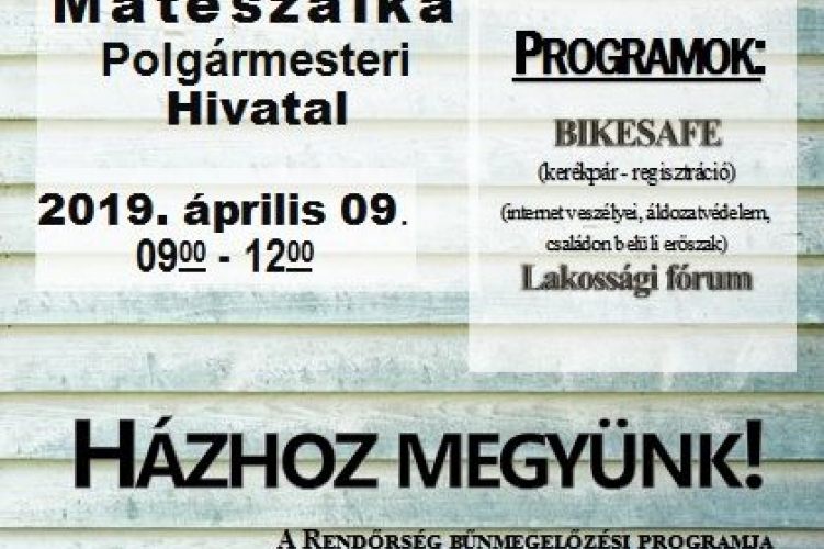 A rendőrség a 2015 őszén útjára indított „Házhoz megyünk” elnevezésű országos kampánysorozatot idén is folytatja. A Szabolcs-Szatmár-Bereg Megyei Rendőr-főkapitányság Bűnmegelőzési Osztályának munkatársai a prevenciós programmal legközelebb április 9-én 9 és 12 óra között Mátészalkán, a Polgármesteri Hivatalnál várják az érdeklődőket. A szakemberek az információs pontokon tájékoztatást adnak a különböző korosztályoknak megfelelő bűnmegelőzési programokról, illetve igény esetén személyes tanácsad