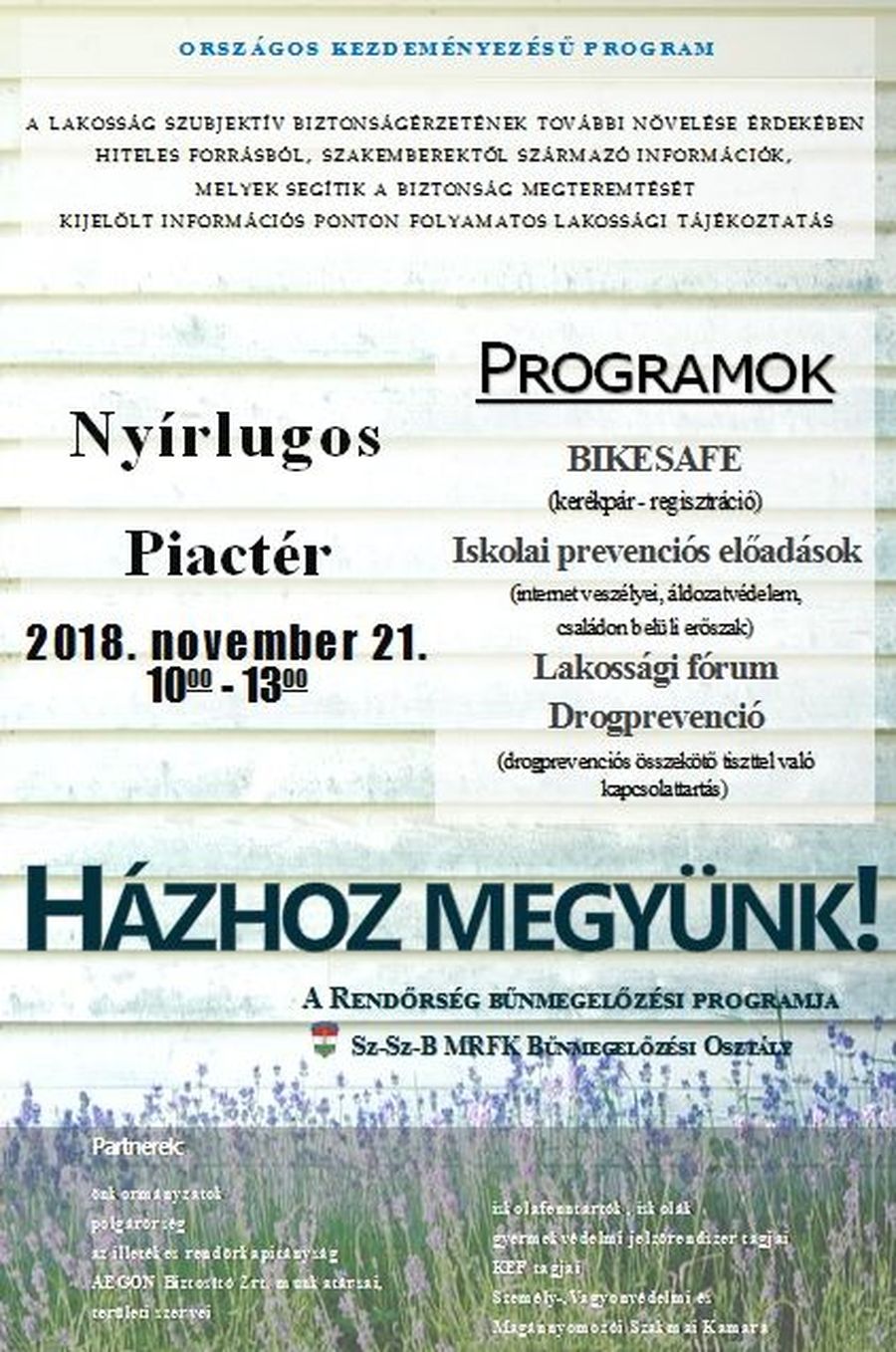 A rendőrség a „Házhoz megyünk!” elnevezésű országos kampánysorozatot idén is folytatja. A Szabolcs-Szatmár-Bereg Megyei Rendőr-főkapitányság Bűnmegelőzési Osztályának munkatársai a prevenciós programmal legközelebb november 21-én 10 és 13 óra között Nyírlugoson, a Piactéren várják az érdeklődőket. A szakemberek a program keretében tájékoztatást és ajánlásokat adnak vagyonvédelemről, az internet veszélyeiről, az áldozatvédelemről és a családon belüli erőszakról. Az országos kampánysorozat fő célja, hogy szakemberektől származó információk közreadásával a rendőrség segítse a közbiztonság növelését és javítsa az állampolgárok önvédelmi képességét. A megjelenteknek a helyszínen lehetőségük nyílik a „BikeSafe” program keretén belül kerékpárjaik ingyenes regisztrációjára.
