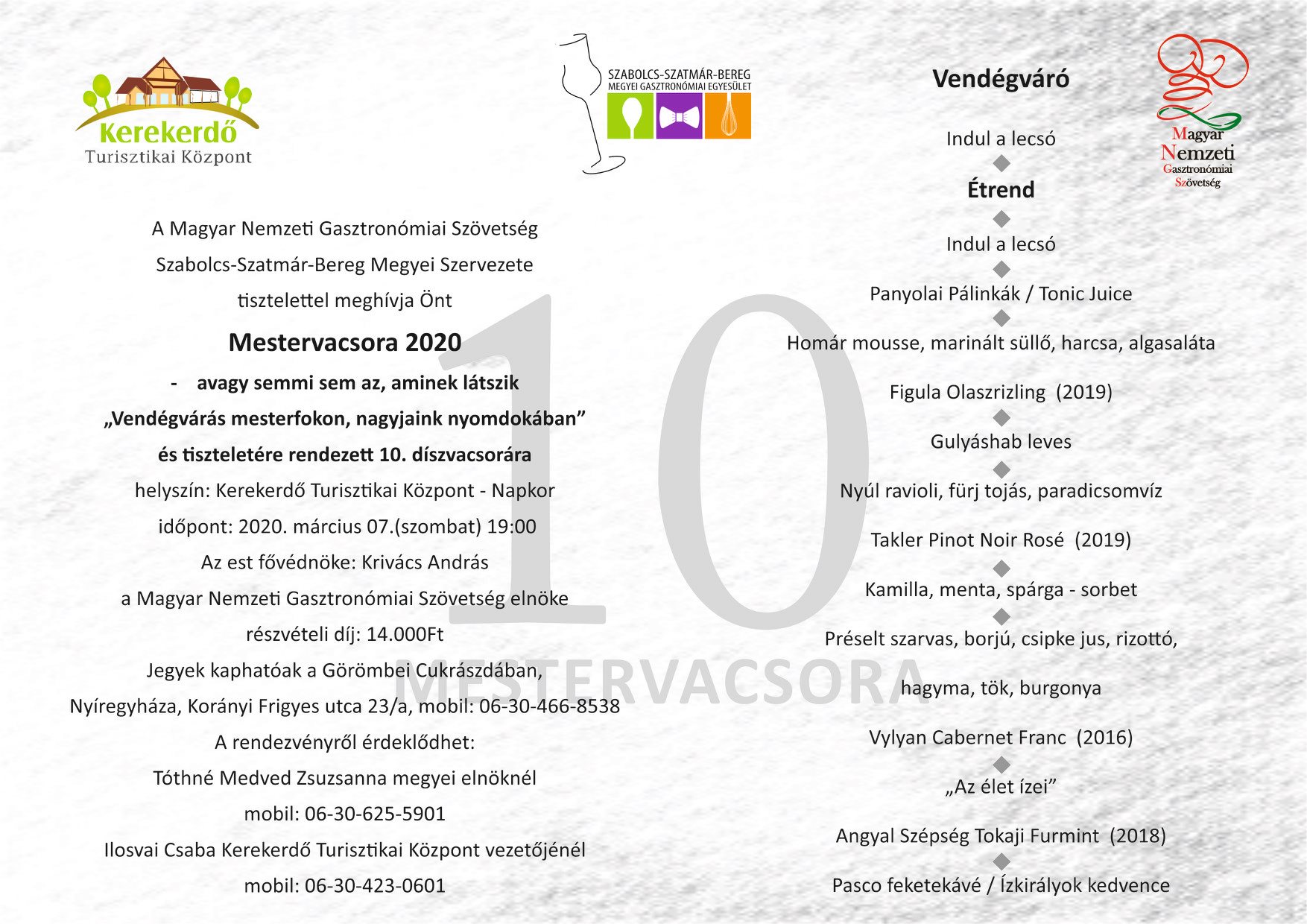 A Magyar Nemzeti Gasztronómiai Szövetség megyei szervezete az idén is a napkori Kerekerdőbe csábítja az ízek szerelmeseit a jubileumi 10. mestervacsorára, melyet ebben az évben március 7-én rendeznek. A vendéglátó szakma ünnepének is tartott rendezvényen az idén is több tucat séf, felszolgáló, cukrász igyekszik majd lenyűgözni a több mint 200 vendéget. A hatfogásos menüt az Élet ízei zárják, ugyanis ez a tányérdesszert fantázianeve, melyről Szabó Sándor Venesz-díjas cukrászmester árult el titkok