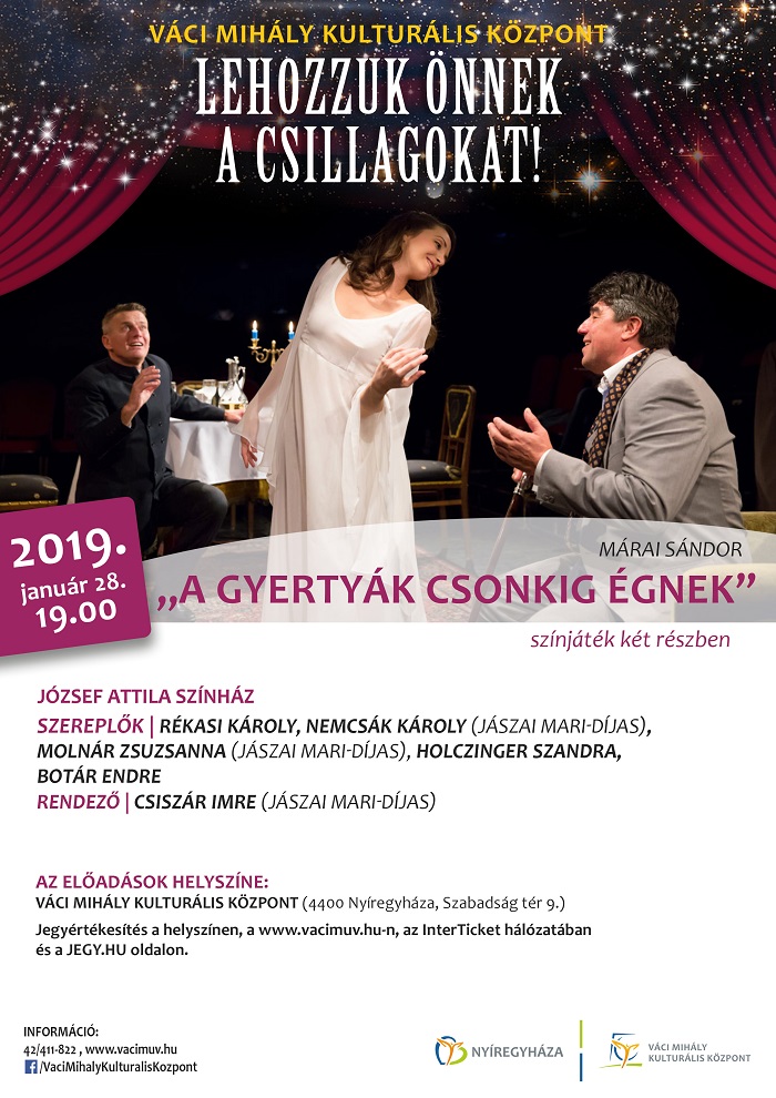 Az új évben is folytatódik a Váci Mihály Kulturális Központban a Lehozzuk Önnek a csillagokat! elnevezésű programsorozat. Január 28-án 19.00 órától a József Attila Színház előadásában A gyertyák csonkig égnek című színjáték lesz látható. A rendező Csiszár Imre, a főbb szerepeket pedig Rékasi Károly, Nemcsák Károly, Molnár Zsuzsanna, Holczinger Szandra és Botár Endre játszák. Az 1942-ben megjelent, nagy indulatoktól feszülő, szuggesztív erejű regény vakító élességgel világít a barátság, a hűség és az árulás ösvényeibe. Két régi barát évtizedek után újra találkozik, és átbeszélgetik az éjszakát. A múltra visszatekintve egyikükből vádlott, másikukból vádló lesz.