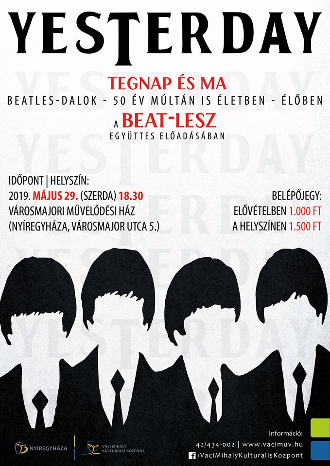 Népszerű Beatles-dalok csendülnek fel a Beat-lesz együttes előadásában május 29-én, szerdán 18:30-tól a Városmajori Művelődési Házban. A zenekar nem ismeretlen a nyíregyházi közönség előtt, hiszen John Lennon születésének 76., halálának 36. évfordulóján, Nyíregyházán is létrejött egy olyan csapat, mely a Beatles dalok élő előadását tekinti legfőbb feladatának, egy olyan könnyűzenei, nemzetközi örökség ápolását, melynek hatása közel 50 év után sem vesztett jelentőségéből. Aki szereti ezt a muzsikát, az nem csalódik majd a szerdai koncerten sem – mondja Orémusz Maja, a Városmajori Művelődési Ház programszervezője.
