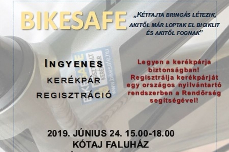 A Szabolcs-Szatmár-Bereg Megyei Rendőr-főkapitányság Bűnmegelőzési Osztályának munkatársai BikeSafe kerékpár-regisztrációra várják az érdeklődőket június 24-én 15 órától 18 óráig Kótaj Faluházban. Az országos nyilvántartási rendszerbe vételhez a rendőrök lefotózzák a jelentkezők kerékpárjait, majd rögzítik a járművek egyedi jellemzőit, és a tulajdonosok adatait. A regisztrált bicikliket végül egy matricával látják el, mely azt jelzi, hogy a kétkerekű már szerepel az adatbázisban. A kezdeményezés célja, hogy lopás esetén a jelölés segítse a keresett kétkerekű azonosítását, vagy a megtalált bicikli tulajdonoshoz történő visszajuttatását.