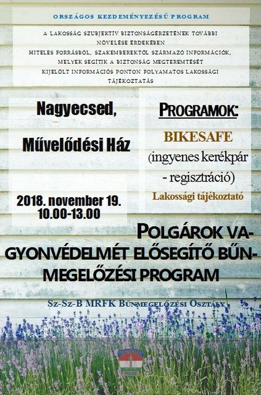 A Szabolcs-Szatmár-Bereg Megyei Rendőr-főkapitányság Bűnmegelőzési Osztálya, valamint a Nagyecsedi Rendőrőrs munkatársai november 19-én, hétfőn 10 és 13 óra között Nagyecseden, a Művelődési Házban „Polgárok vagyonvédelmét elősegítő bűnmegelőzési programmal" várják az érdeklődőket. A kijelölt információs ponton szakemberek adnak személyre szabott tanácsokat és ajánlásokat az állampolgárok vagyonbiztonságának növelése érdekében. Az országos kezdeményezésű kampánysorozat célja, hogy szakembere