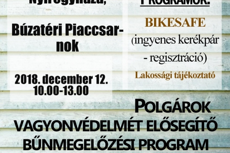 A Szabolcs-Szatmár-Bereg Megyei Rendőr-főkapitányság Bűnmegelőzési Osztályának munkatársai 2018. december 12-én Nyíregyházán a Búzatéri Piaccsarnokban 10-13-óráig a „Polgárok vagyonvédelmét elősegítő” bűnmegelőzési programmal várják az érdeklődőket. A kijelölt információs ponton szakemberek adnak személyre szabott tanácsokat és ajánlásokat a vagyonbiztonság növelése érdekében. Az országos kezdeményezésű kampánysorozat célja, hogy szakemberektől származó információk közreadásával a rendőrség segítse a közbiztonság növelését és javítsa az emberek önvédelmi képességét. A megjelenteknek a helyszínen lehetőségük nyílik a „BikeSafe” program keretén belül kerékpárjaik ingyenes regisztrációjára is.