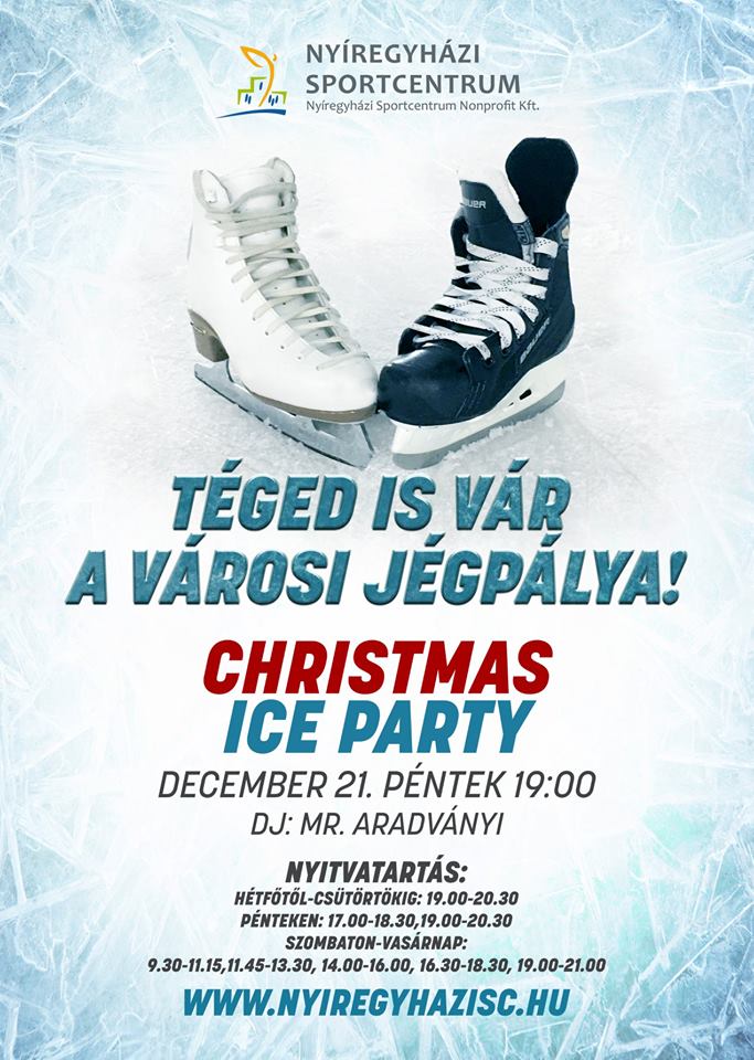 A Nyíregyházi Sportcentrum ezen a héten december 21-én, pénteken 19.00 órától rendezi meg a Christmas Ice Party elnevezésű karácsonyi jégdiszkóját a Városi Jégpályán, melyre mindenkit várnak szeretettel.