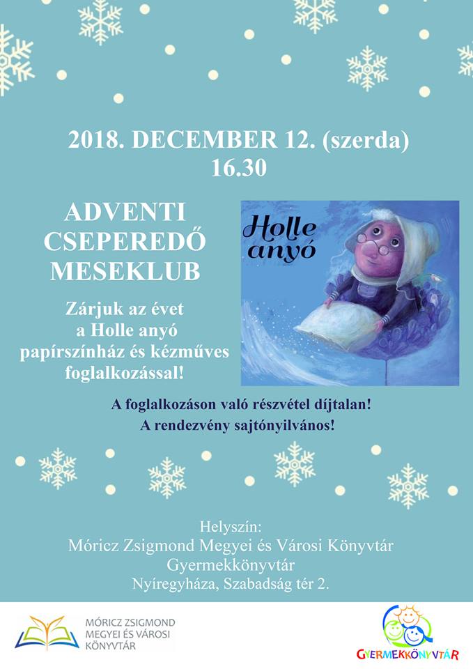 Decemberi 12-én, szerdán 16.30 órától Cseperedő Meseklubra várják a gyerekeket a Móricz Zsigmond könyvtárba. Holle anyó papírszínház és kézműves foglalkozással zárják az évet. A foglalkozáson való részvétel díjtalan.