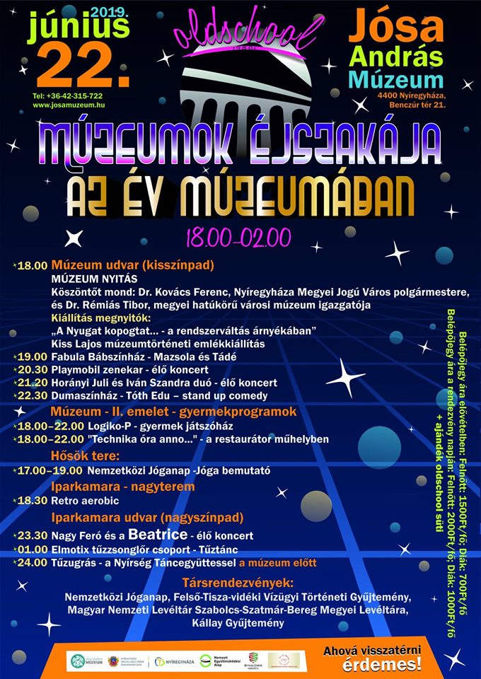 Országszerte 400 intézmény várja a közönséget csaknem 2000 programmal június 22-én, a 17. Múzeumok éjszakáján, melynek "fővárosa" idén Szombathely lesz. Közép-Európa legnagyobb és legnépszerűbb muzeális eseményéhez Nyíregyháza is csatlakozott. A programok sora a Jósa András Múzeum udvarán szombaton, 18.00 órakor kezdődik. A gyerekeket bábszínház és játszóház is várja. A felnőttek jó hangulatáról pedig számos koncert gondoskodik. De láthatunk még különleges tűzugrást, részt vehetünk Retro aerobicon és jógázhatunk is. A múzeum programjairól bővebb információk az esemény facebook oldalán vagy a josamuzeum.hu oldalon találhatók.