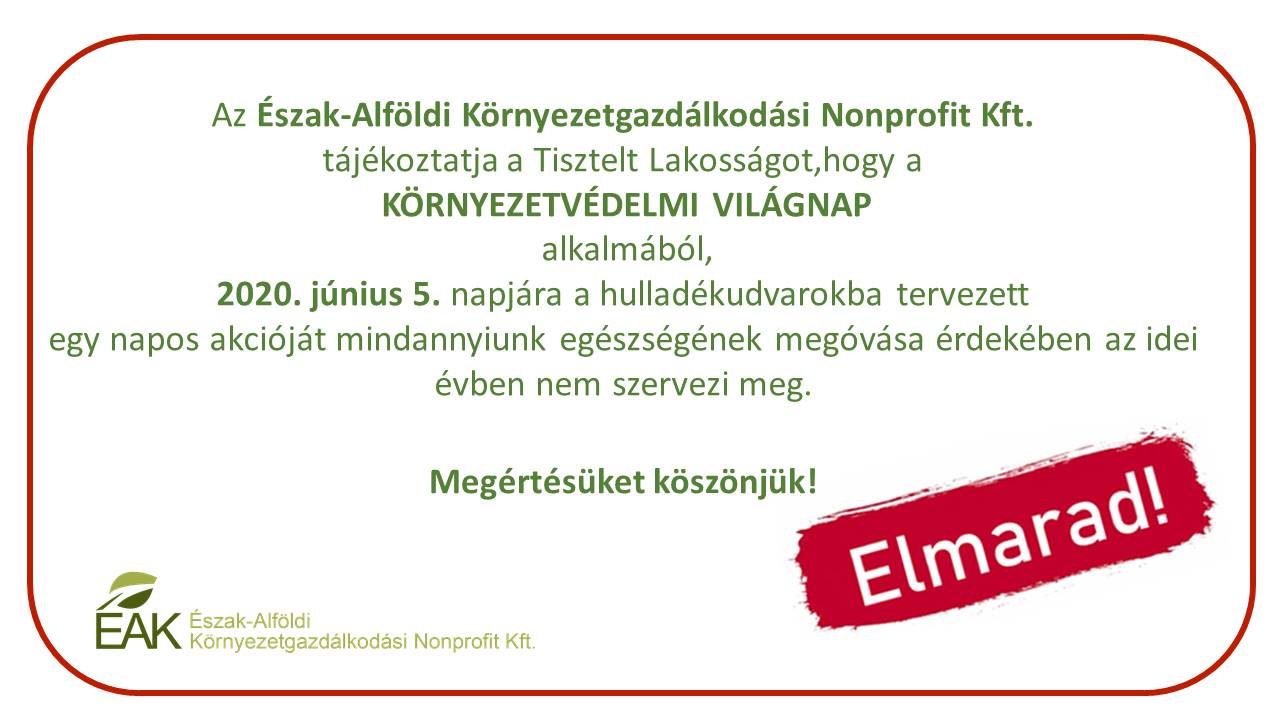 Az Észak-Alföldi Környezetgazdálkodási Nonprofit Kft. tájékoztatja a lakosságot, hogy a Környezetvédelmi Világnap alkalmából, június 5-én a hulladékudvarokba tervezett egynapos akcióját mindannyiunk egészségének megóvása érdekében az idei évben nem szervezi meg.