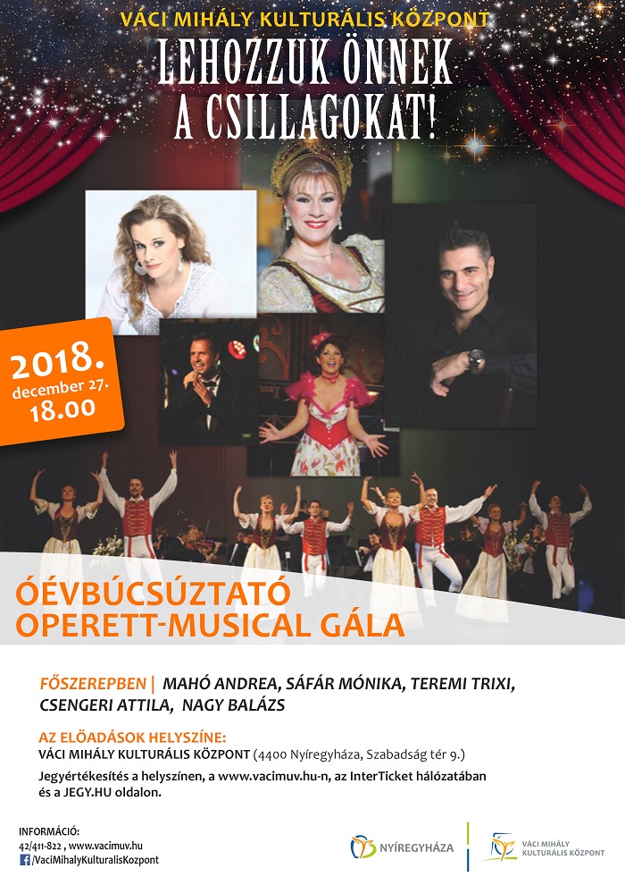 A Lehozzuk Önnek a csillagokat! programsorozat részeként, különleges operett-musical gálával búcsúztatja az óévet a Váci Mihály Kulturális Központ december 27-én, csütörtökön 18.00 órától. Főszerepben Mahó Andrea, Sáfár Mónika, Teremi Trixi, Csengeri Attila, Nagy Balázs látható és hallható.