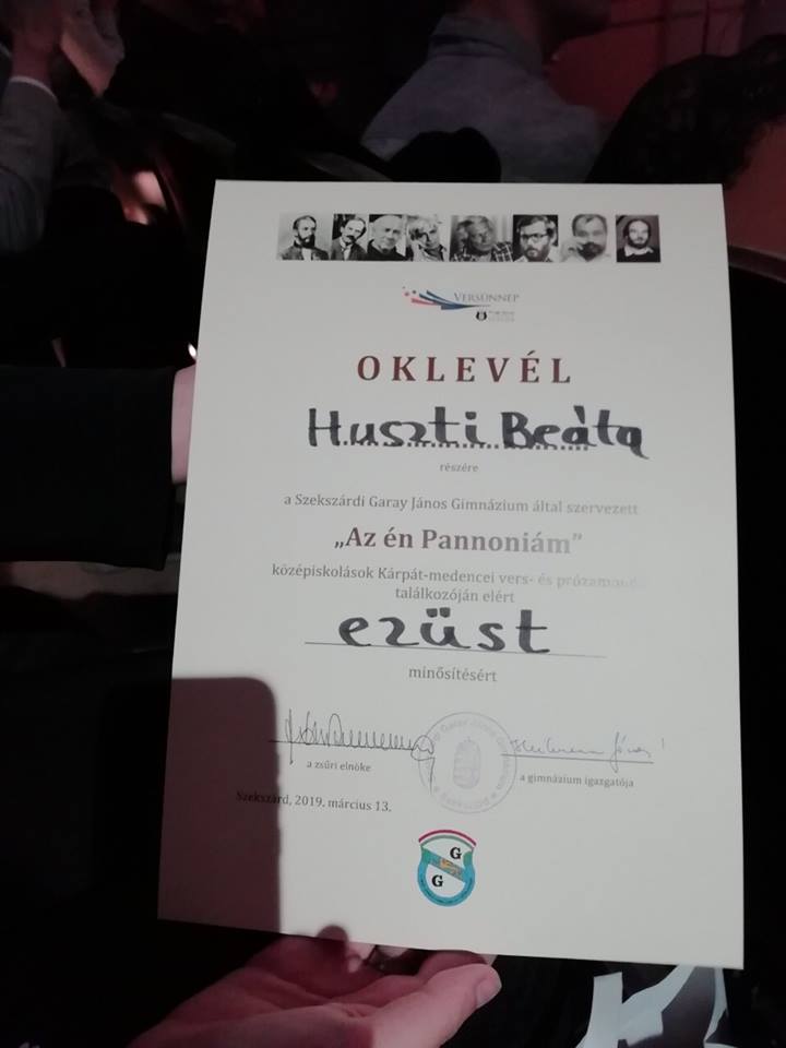 A Nyíregyházi SZC Sipkay Barna Kereskedelmi, Vendéglátóipari, Idegenforgalmi Szakgimnáziuma, Szakközépiskolája és Kollégiuma 11. c osztályos tanulója, Huszti Beáta, "Az én Pannóniám" középiskolások Kárpát-medencei vers- és prózamondó találkozóján ezüst minősítést szerzett. Felkészítő tanára: Kellerné Rafaez Noémi.