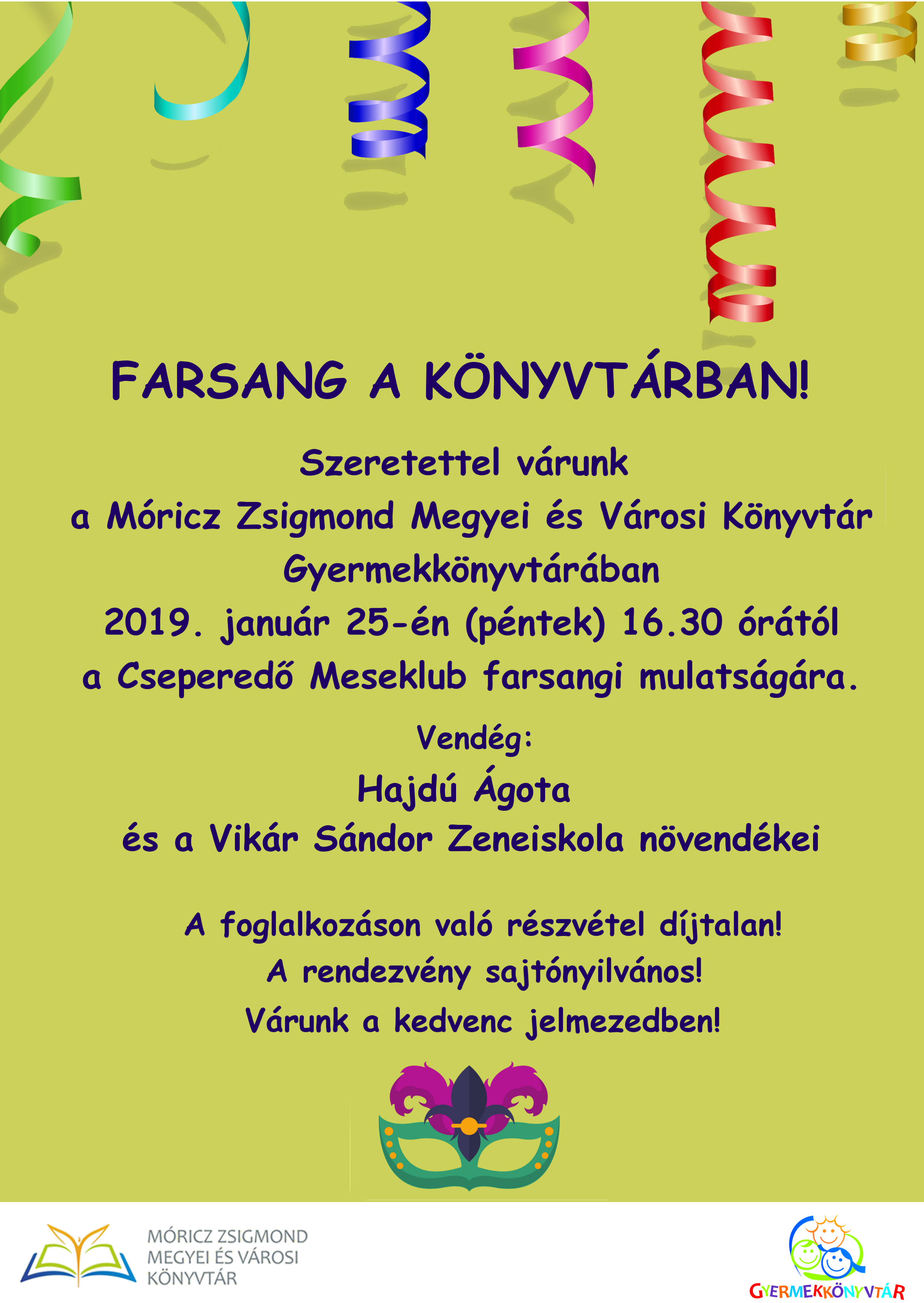 A Cseperedő Meseklub farsangi mulatságot szervez a Móricz Zsigmond Megyei és Városi Könyvtár Gyermekkönyvtárában január 25-én (pénteken) 16.30 órától. A vendég Hajdú Ágota zenetanár és a Vikár Sándor Zeneiskola növendékei. A foglalkozáson való részvétel ingyenes. Minden gyermeket szeretettel várnak a kedvenc jelmezében.