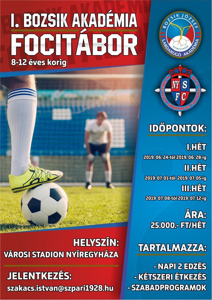 Focitábort szerveznek Nyíregyházán. A Bozsik József Labdarúgó Akadémia idén nyáron először várja focitáborba június 24. és július 12. között, 3 turnusban - előképzettségtől függetlenül - azokat a 8 és 12 év közötti fiúkat és lányokat, akik szeretnék jó hangulatban, egy jó közösségben, foci köré épülő programokkal eltölteni a nyári szünidőt. A foci mellett természetesen más programokat is szerveznek a résztvevő gyerekek számára. Bővebb információt a táborról a Nyíregyháza Spartacus facebook oldal