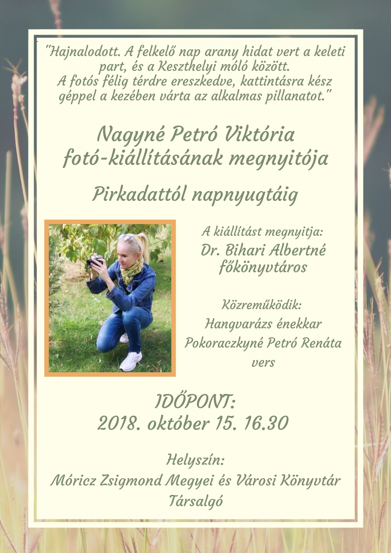Október 15-én, hétfőn 16.30 órától Nagyné Petró Viktória Pirkadattól napnyugtáig című fotó-kiállításának megnyitójára várják a művészetek iránt érdeklődőket a Móricz Zsigmond Könyvtár társalgójába. A kiállítást megnyitja Dr. Bihari Albertné főkönyvtáros, közreműködik a Hangvarázs énekkar és Pokoraczkyné Petró Renáta.