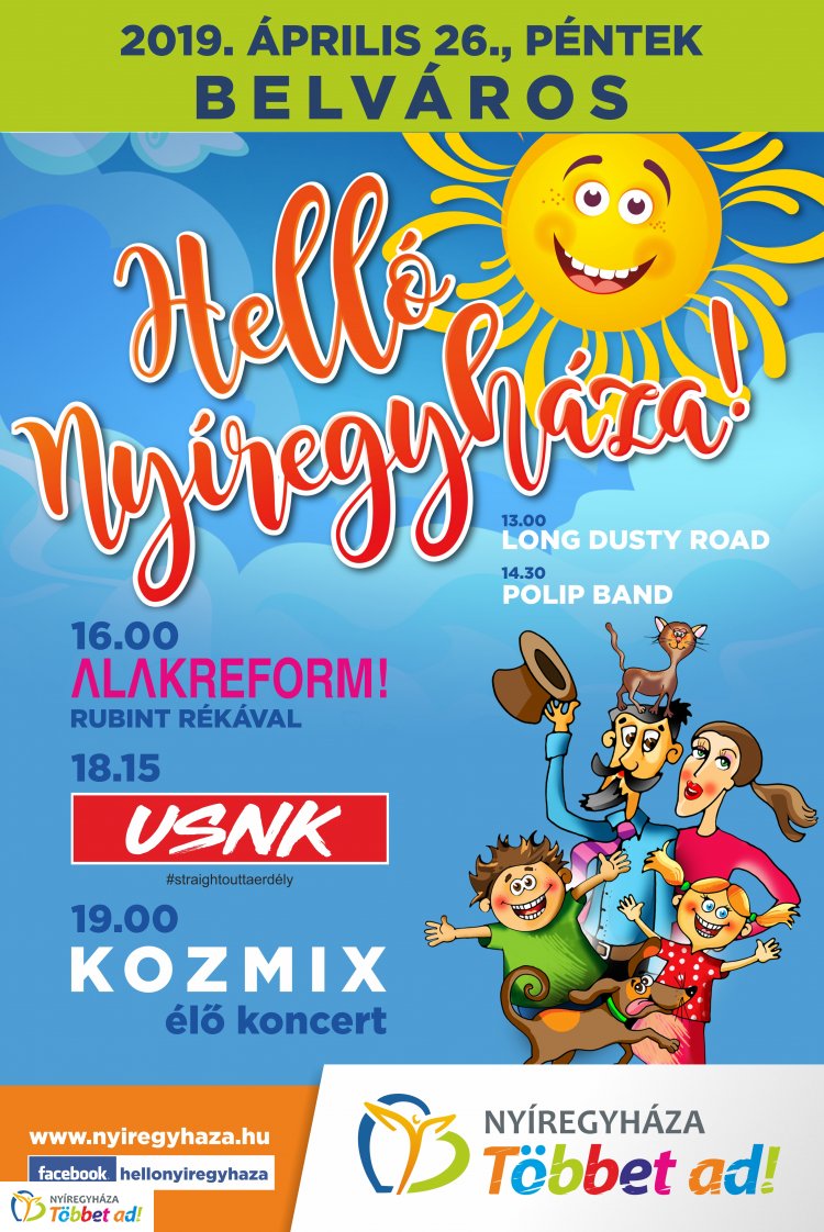 Április 26. újra megrendezik a Helló Nyíregyházát!. Az idei rendezvényen is különféle programok és sztárfellépők várják a belvárosba látogatókat. Az esemény plakátja szerint Rubint Réka, a USNK és a Kozmix érkezik városunkba.