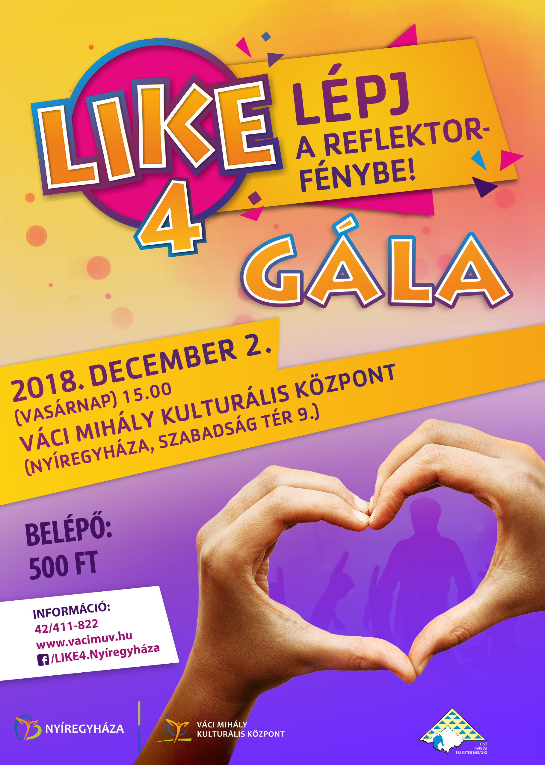 Október végén lezajlott Nyíregyháza legnagyobb tehetségkutató versenye, a LIKE 4, ahol tánc és ének kategóriában méretették meg magukat a versenyzők. Nehéz volt a szakmai zsűri dolga, hisz mindenki rendkívül színvonalas produkciót nyújtott. December 2-án, vasárnap pedig megrendezik a LIKE 4 gálát, ahol a helyezést elért résztvevők és különdíjasok, valamint további tehetségek csillogtatják meg tudásukat újra a Váci Mihály Kulturális Központ színpadán.