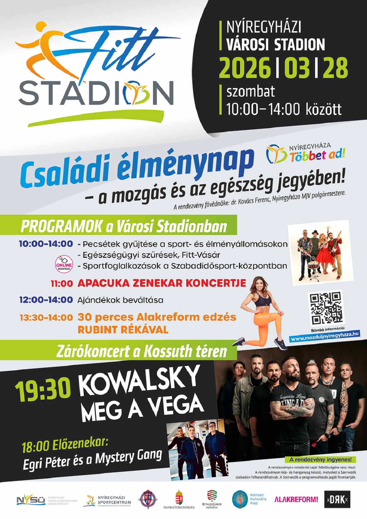 Hatalmas dobással indítja a szabadtéri szezont a Mozdulj Nyíregyháza! csapata: március 28-án, szombaton rendezik meg a Városi Stadionban az első Fitt Stadion családi élménynapot. 10:00 és 14:00 óra között sportos kihívásokkal, bemutatókkal és egy izgalmas pecsétgyűjtő játékkal várják a mozogni vágyókat, ahol mindenki próbára teheti az erőnlétét. A hangulatot zenei fellépők pörgetik fel, a gyerekek nagy kedvence, az Apacuka Zenekar után, este a Kowalsky meg a Vega koncertje teszi fel a koronát az egész napos pörgésre. Ez az esemény csak a kezdete a 2026-os nyíregyházi sportprogramoknak, szóval érdemes lesz a sportcipőket készenlétben tartani az egész szezonban!