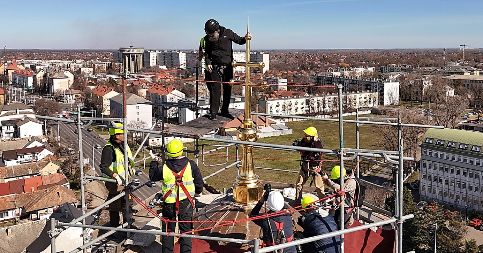 Kocsis Fülöp érsek-metropolita személyesen mászott fel a 40 méter magas toronyba, hogy helyére tegye a debreceni Attila téri görögkatolikus főszékesegyház felújított keresztjét.