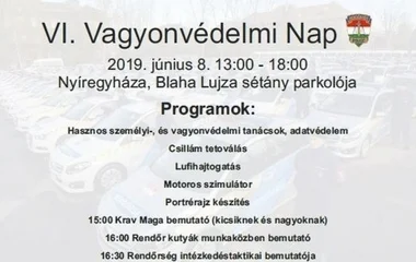 Idén hatodik alkalommal rendez vagyonvédelmi napot a Szabolcs-Szatmár-Bereg Megyei Rendőr-főkapitányság Bűnmegelőzési Osztálya Nyíregyházán, a Blaha Lujza sétány parkolójában június 8-án 13 órától 18 óráig. A rendezvény célja a figyelemfelhívás arra, hogy minimális anyagi ráfordítással és kis odafigyeléssel a vagyon elleni bűncselekmények jelentős része megelőzhető. Az érdeklődőket egész délután hasznos, emellett színes és látványos programok várják. Az eseményen a kerékpárral érkezőknek lehetős