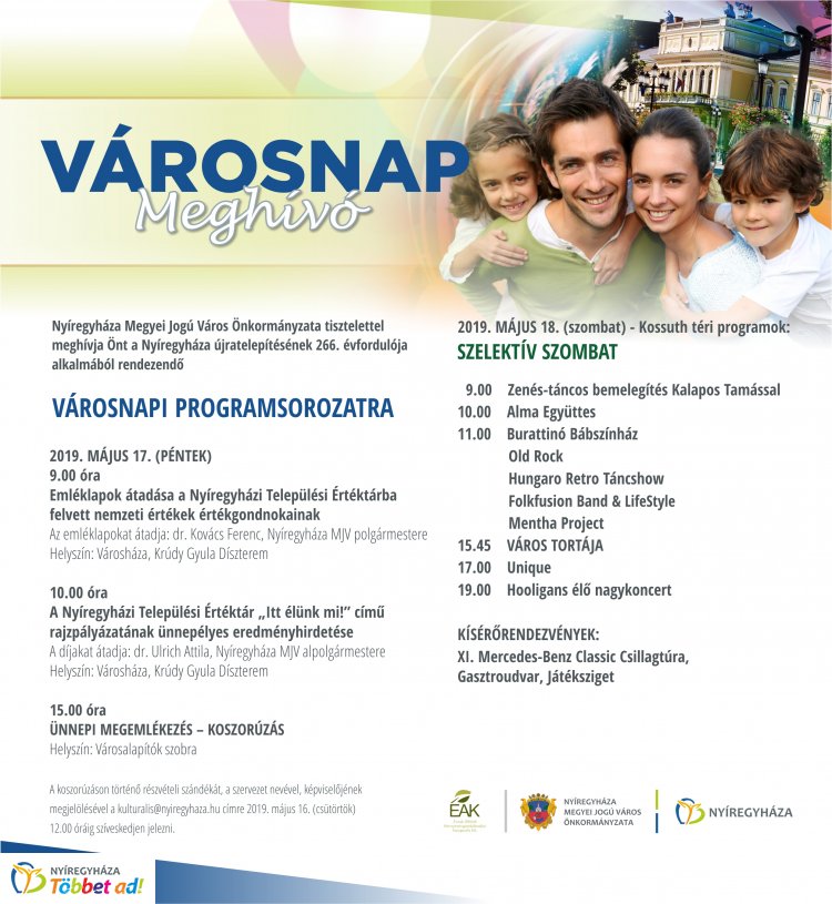 Idén is hatalmas bulival ünnepli Nyíregyháza újratelepítésének 266. évfordulóját. A Városnapi programsorozat május 17-én, pénteken kezdődik, ahol többek között kihirdetik az „Itt élünk mi” elnevezésű, a Nyíregyházi Települési Értéktár által még év elején meghirdetett rajzpályázat győzteseit. Másnap pedig a Szelektív szombat programjaival folytatódik az ünneplés. A Kossuth téren már 9 órától várják a városlakókat. Számos koncert gondoskodik a remek hangulatról. 17.00 órától a Unique, 19.00 órától pedig a Hooligans lép színpadra. De persze idén is elkészül a város tortája. A minden eddiginél nagyobb, Szabolcsi tejfölös diótorta nevet viselő, 2500 szeletes finomságot idén is a sipkaysok készítik el, és kínálják meg vele a jelenlévőket. A gyereket bábelőadás várja. Kísérőprogramként a Mercedes-Benz Csillagtúra elemeként különleges autócsodák is ellepik a belvárost, valamint lesz gasztroudvar és játéksziget is.