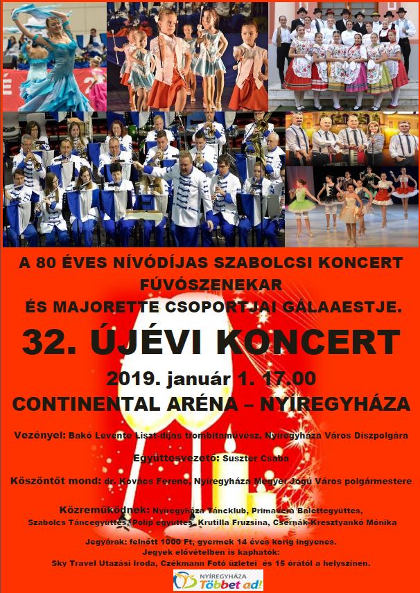 A hagyományoknak megfelelően az idén is a Nívódíjas Szabolcs Koncert Fúvószenekar újévi koncertjével indul január elsején a programok sora Nyíregyházán. Minden évben különleges hangversenyt láthatnak a Continental Arénába érkezők az újév első napján, de az idei 32. gálaest további meglepetéseket is tartogat, hiszen az idén ünnepli fennállásának 80. évfordulóját a zenekar. A 17 órakor kezdődő koncert igen látványos lesz, hiszen a zenekar és majorett csoport mellett közreműködik a Nyíregyháza Tánc
