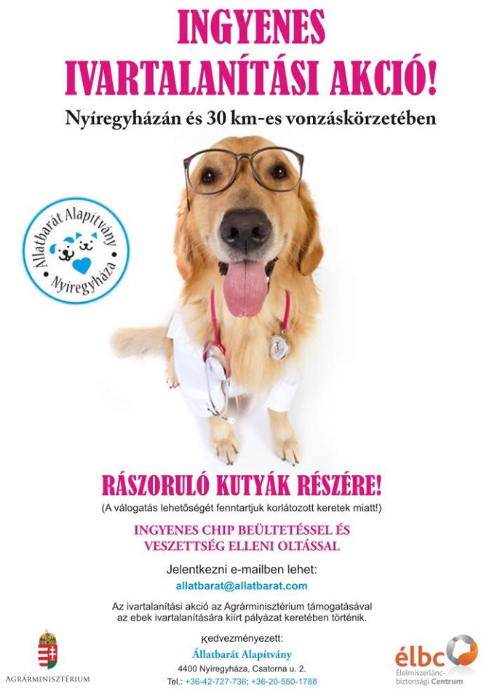 A nyíregyházi Állatbarát Alapítvány ingyenes ivartalanítási akciót hirdet Nyíregyházán és 30 kilométeres vonzáskörzetében. Jelentkezni kizárólag e-mailben, az allatbarat@allatbarat.com e-mail címen lehetséges. Az ivartalanítás mellett a kiválasztott kutyusok veszettség elleni védőoltást és mikrochipet is kapnak, díjmentesen.