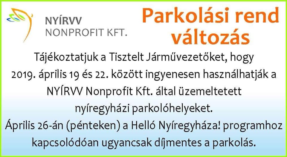 Április 26-án, pénteken hatalmas pezsgés várható a belvárosban, ugyanis akkor rendezik meg az idei Helló, Nyíregyházát. Az eseményhez kapcsolódva a NYÍRVV Nonprofit Kft. által üzemeltetett parkolókban ingyenes lesz a parkolás pénteken.