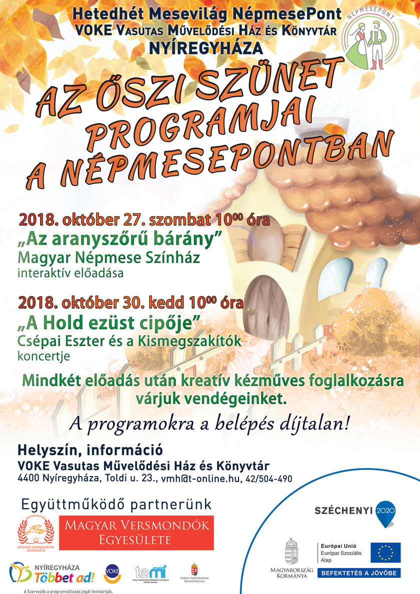 Az őszi szünet első napján, október 27-én a Magyar Népmese Színház interaktív előadásában látható Az aranyszőrű bárány című népmese a Hededhét Mesevilág NépmesePontban, ahol kreatív kézműves foglalkozás is várja a gyerekeket. A 10 órakor kezdődő programra a belépés ingyenes, a Nyíregyháza, Toldi u. 23. szám alatt lévő VOKE Vasutas Művelődési Ház és Könyvtárban.