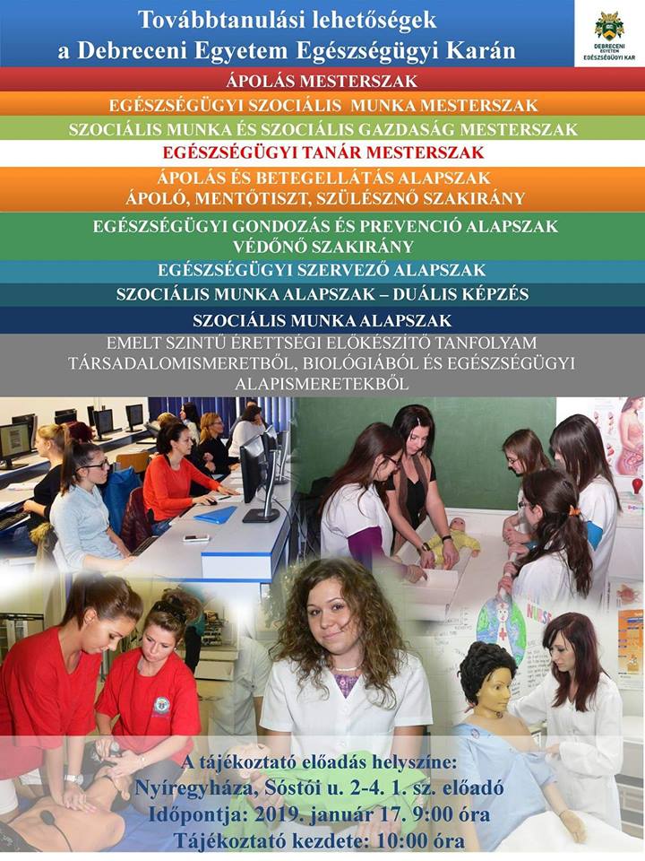 Interaktív nyílt napra várja a továbbtanulás előtt álló középiskolásokat a Debreceni Egyetem Egészségügyi Kara. A január 17-én, csütörtökön 9 órától kezdődő rendezvényen a diákok és szüleik tájékoztatást kapnak a 2019-es felvételi eljárásról, az intézmény sajátosságairól, a kar képzési struktúrájáról, valamint az induló alap- és mesterszakokról. Az érdeklődők megismerhetik az oktatás során használt látványos demonstrációs eszközöket is, például a terhességi és anyasági modellt, és elsősegély-nyújtási bemutatón vehetnek részt.