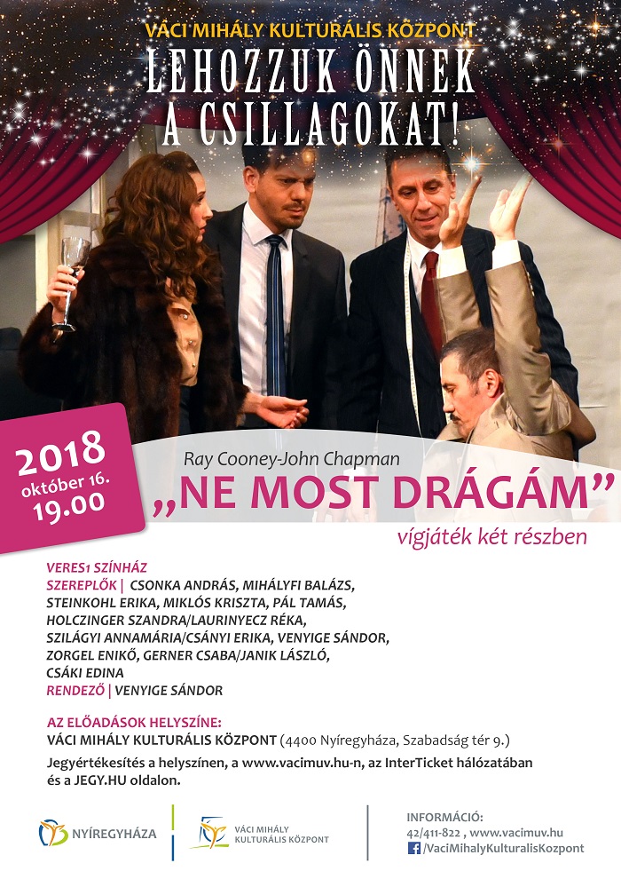 Egy újabb izgalmasnak ígérkező darabbal folytatódik a Váci Mihály Kulturális Központban a Lehozzuk Önnek a csillagokat rendezvénysorozat. Október 16-án, kedden 19 órától egy fergeteges előasdással várják az érdeklődőket. A Ne most, drágám! rendezője, a Nyíregyházán jól ismert Venyige Sándor, a főbb szerepeket Csonka András és Mihályfi Balázs játsszák. A vígjáték egyik legfontosabb helyszíne egy elegáns londoni szőrmeszalon, ahol különös adás-vétel zajlik.