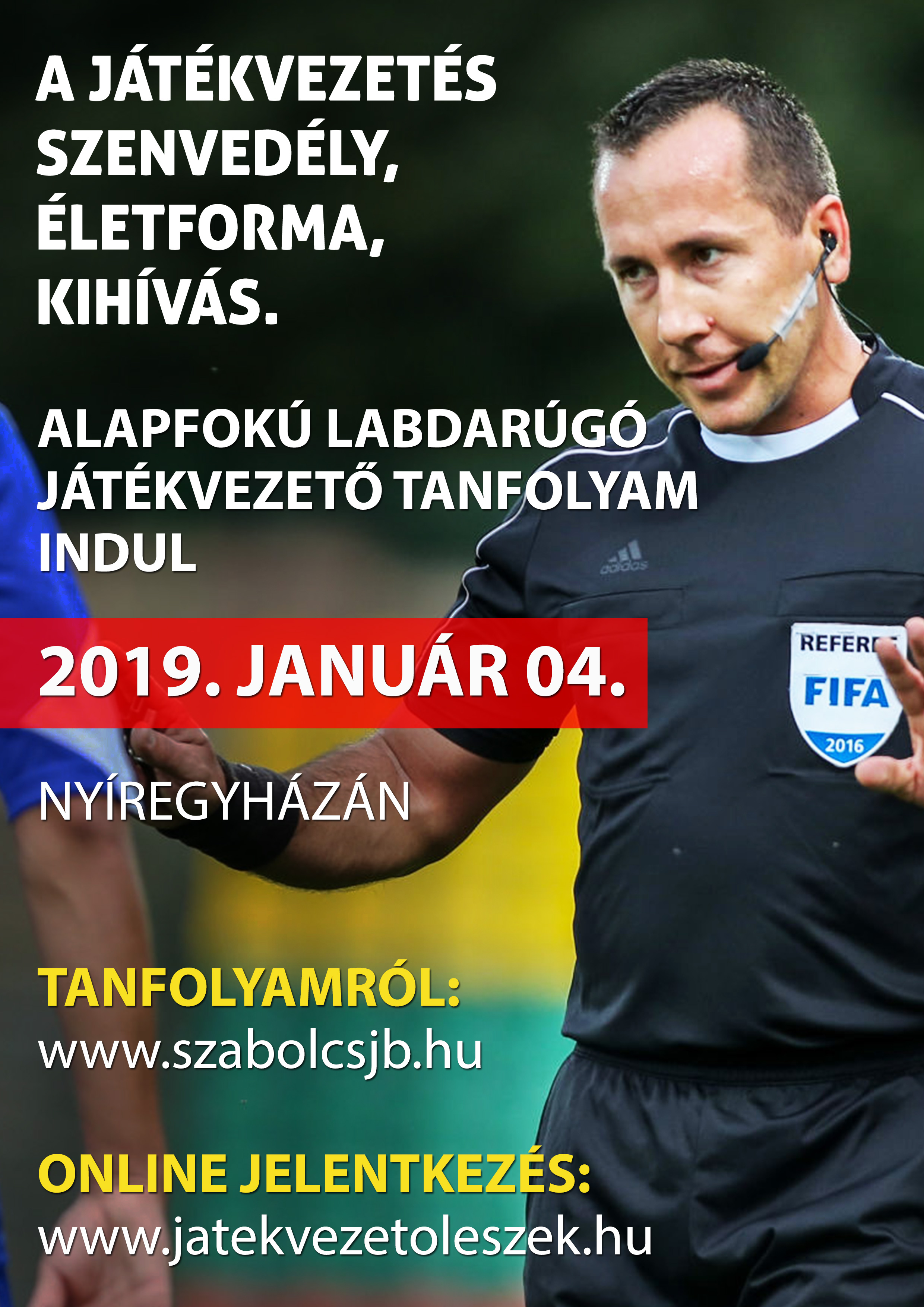 Az MLSZ Szabolcs-Szatmár-Bereg Megyei Játékvezető Bizottsága alapfokú labdarúgó játékvezető tanfolyamot indít Nyíregyházán 2019. január 4-i kezdéssel. A péntek délutánonként tartandó 65 órás tanfolyam márciusban fejeződik be, és a sikeresen vizsgázott kollégák már tavasszal be is kapcsolódhatnak a megyei játékvezetés életébe. A jelentkezés feltételei: - betöltött 14. életév, - erkölcsi bizonyítvány,- érvényes sportorvosi igazolás. További információkat a szabolcsjb.hu oldalon találhatnak az érde