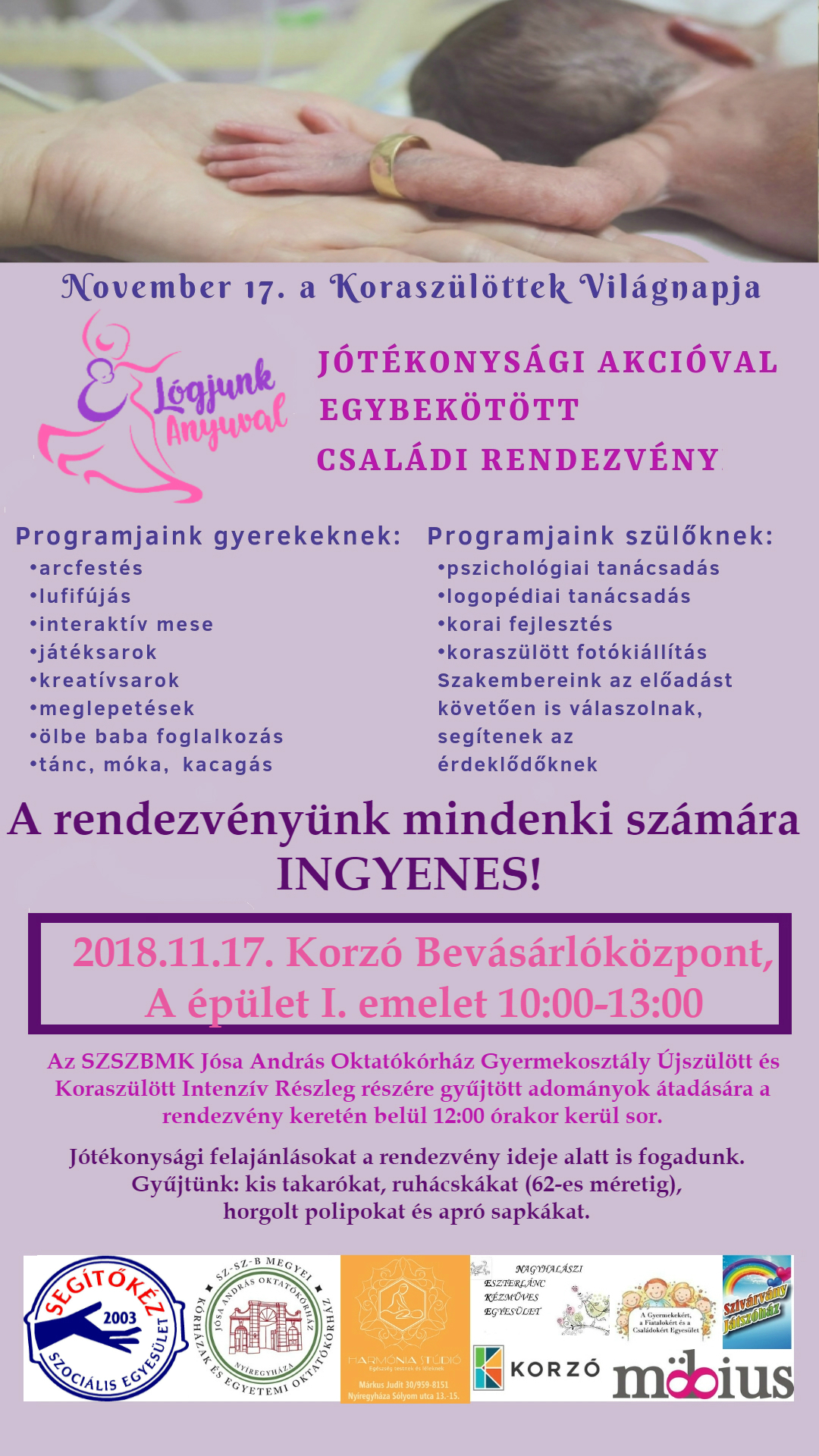 A koraszülöttek világnapján a "Lógjunk Anyuval!" elnevezésű formáció, nagyszabású jótékonysági akcióval egybekötött családi napot szervez a Korzó Bevásárlóközpontban, a Jósa András Oktatókórház Újszülött és Koraszülött Intenzív Részlegén erősödő csöppségek támogatására. A november 17-én, szombaton tíz órakor kezdődő rendezvény célja, felhívják a figyelmet egy olyan égető problémára, mely mellett nem hunyhatunk szemet. A koraszülöttek hatalmas csatájában, melyet az életben maradásért ví