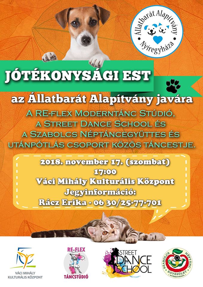 Jótékonysági estet szerveznek az Állatbarát Alapítvány javára november 17-én, szombaton 17.00 órától. A RE-flex Moderntánc Stúdió, a Street Dance School, valamint a Szabolcs Néptáncegyüttes és utánpótlás csoport közös táncestjére várják a segíteni akarókat a Váci Mihály Kulturális Központba.