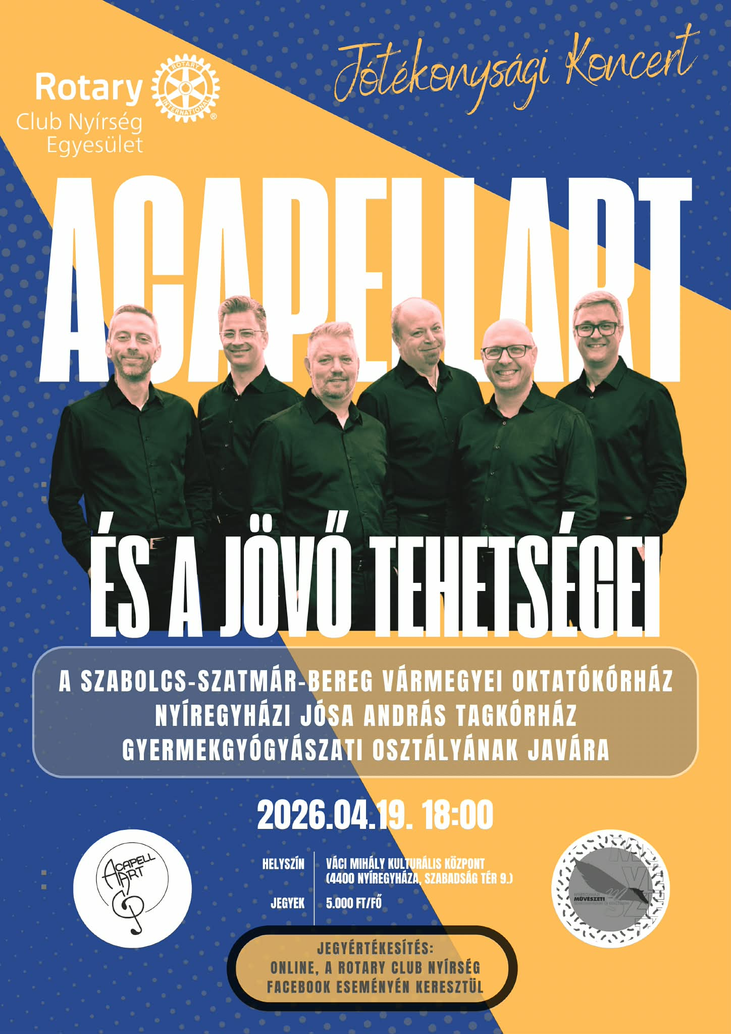 Jótékonysági koncertet szervez a beteg gyermekekért a Rotary Club Nyírség április 19-én, vasárnap 18 órától a nyíregyházi Váci Mihály Kulturális Központban. Az esten az AcapellArt Énekegyüttes mellett a Művészeti Szakgimnázium ifjú zenészei és táncosai lépnek fel. A teljes bevételt a Jósa András Tagkórház gyermekosztályának támogatására fordítják.