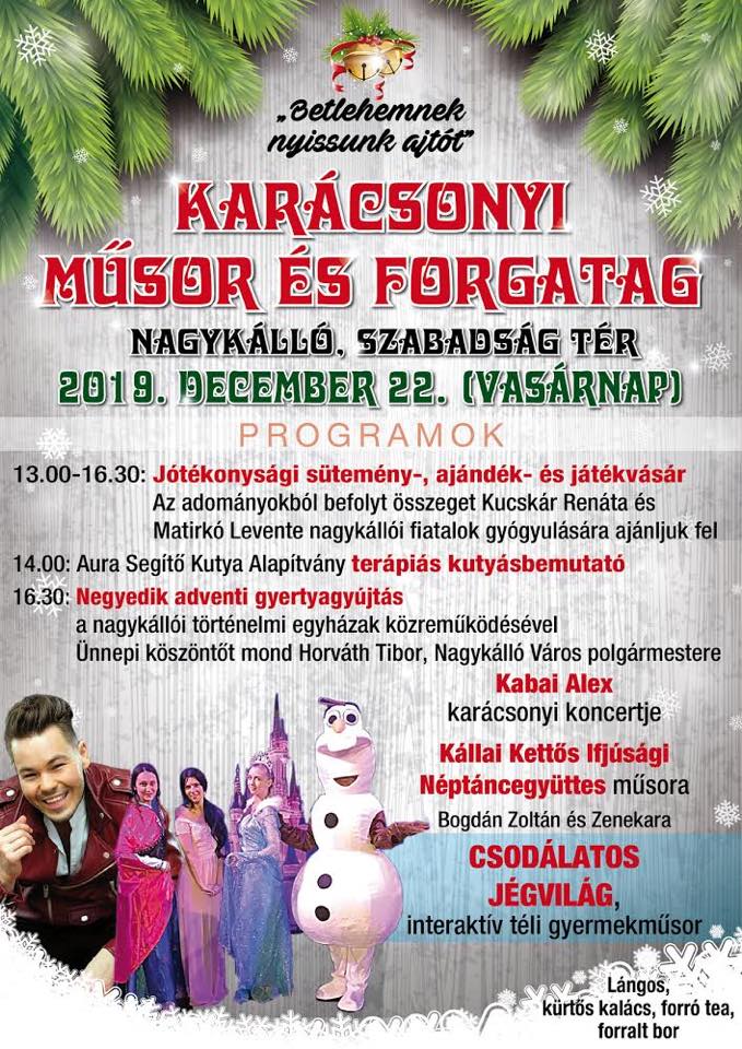 Jótékonysági vásárt rendeznek Nagykállóban. Advent utolsó vasárnapján, december 22-én süteményt, ajándékot, játékot lehet vásárolni a Szabadság téri forgatagban, melynek bevételét a szervezők két helybéli fiatal, Kulcsár Renáta és Martinkó Levente gyógyulására ajánlják fel. A negyedik gyertya meggyújtása után Kabai Alex karácsonyi koncertjét élvezhetik az ünnepre hangolódók.
