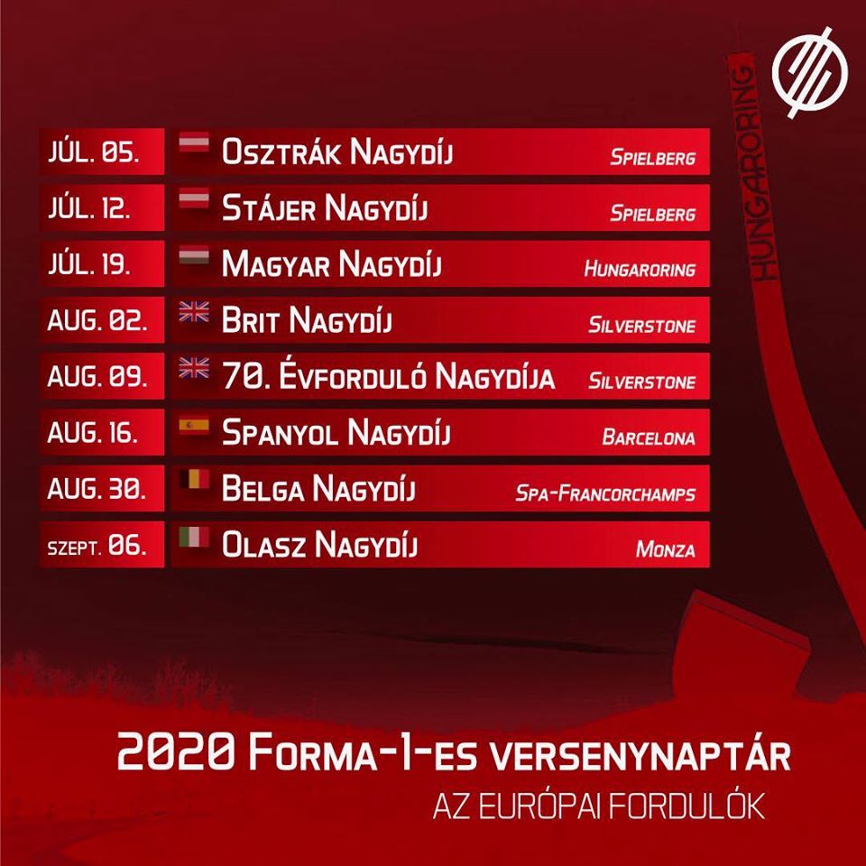 Július 19-én versenyez a Forma-1-es világbajnokság mezőnye a Hungaroringen - derült ki a sorozat kereskedelmi jogait birtokló Liberty Media közleményéből, amely a koronavírus-járvány miatt csak júliusban elrajtoló idény első nyolc versenyhétvégéjét tartalmazza. A Nemzetközi Automobil Szövetség (FIA) által is elfogadott naptár szerint július első két hétvégéjén az osztrák Spielbergben, a Red Bull Ringen két versenyt is rendeznek, majd a csapatok Magyarországra utaznak. A mogyoródi futam után két héttel Nagy-Britannia következik, Silverstone-ban szintén két egymást követő hétvégén versenyez a mezőny, amely aztán Spanyolországba, Belgiumba és Olaszországba látogat el szeptember elejéig.