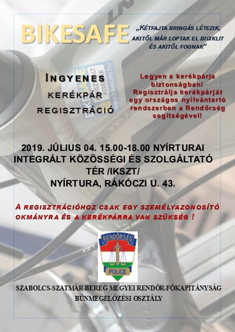 Nyírturán is lesz BikeSafe regisztráció. A Megyei Rendőr-főkapitányság munkatársai BikeSafe kerékpár-regisztrációra várják az érdeklődőket július 4-én, csütörtökön 15 órától 18 óráig a nyírturai Integrált Közösségi és Szolgáltató Téren. Az országos nyilvántartási rendszerbe vételhez a rendőrök lefotózzák a jelentkezők kerékpárjait, majd rögzítik a járművek egyedi jellemzőit, és a tulajdonosok adatait. A regisztrált kerékpárokat végül egy matricával látják el, ami jelzi, hogy a jármű szerepel az
