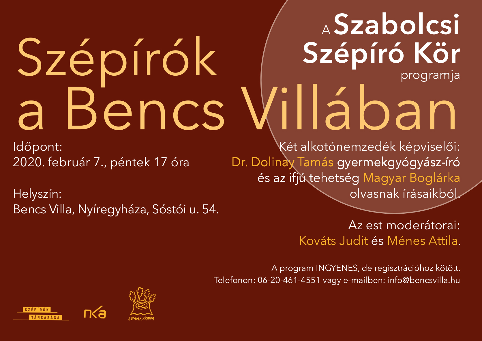 Mi késztet arra egy messziföldön ismert gyermekgyógyász főorvost, és egy elsőéves egyetemistát, hogy szépirodalmi alkotásra adja a fejét? Magyar Boglárkától és Dr. Dolinay Tamástól, február 7-én 17 órai kezdettel megtudhatják az érdeklődők, a Szabolcsi Szépíró Kör legközelebbi rendezvényén a Bencs Villában. A program INGYENES, de regisztrációhoz kötött. A szervezők kérik, jelezzék részvételi szándékukat telefonon vagy e-mailben: info@bencsvilla.hu.