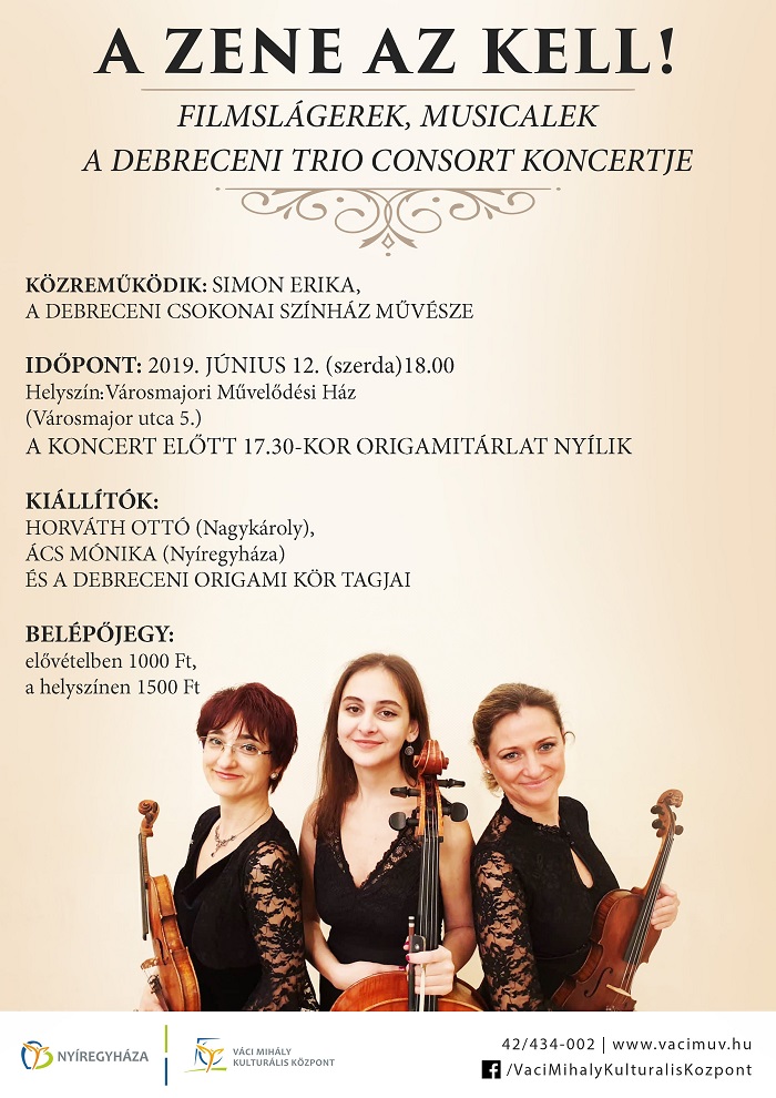 Szerdán is várja a látogatókat a Városmajori Művelődési Ház, két rendezvény is követi egymást. Délután fél hattól egy különleges origami kiállítást láthatnak az érdeklődők, hat órától pedig már a zenéé lesz a főszerep, mégpedig a Zene az kell címmel filmslágerek és musicalek csendülnek fel. A három művésztanárból álló együttes előadásában olyan ismert dalokat hallhatunk, mint az Egy asszony illata, vagy éppen a Volt egyszer egy Amerika főcímdala. A fél hatkor nyíló origami kiállítás is különlegesnek ígérkezik, melyről Orémusz Maja, a Városmajori Művelődési Ház programkoordinátora árult el részleteket rádiónknak.