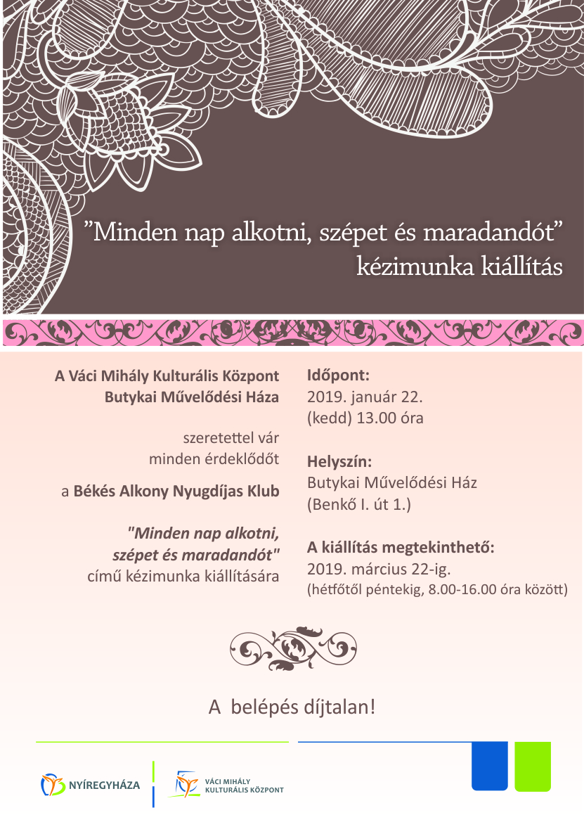 "Minden nap alkotni, szépet és maradandót" címmel kézimunka kiállítás nyílik a Butykai Művelődési Házban. A Békés Alkony Nyugdíjas Klub kézimunka kiállításának megnyitójára szeretettel várnak minden érdeklődőt január 22-én, kedden 13:00 órától. A kiállítás megtekinthető: március 22-ig (hétfőtől péntekig, 8.00-16.00 óra között). A belépés díjtalan.