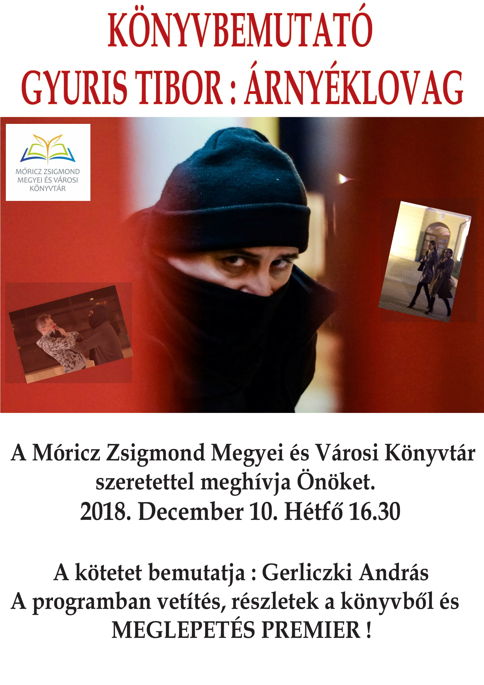 A Móricz Zsigmond Megyei és Városi Könyvtár december 10-én, hétfőn 16.30 órakor Gyuris Tibor – Árnyéklovag című könyvének bemutatójára várja az érdeklődőket. A kötetet bemutatja, Gerliczki András.