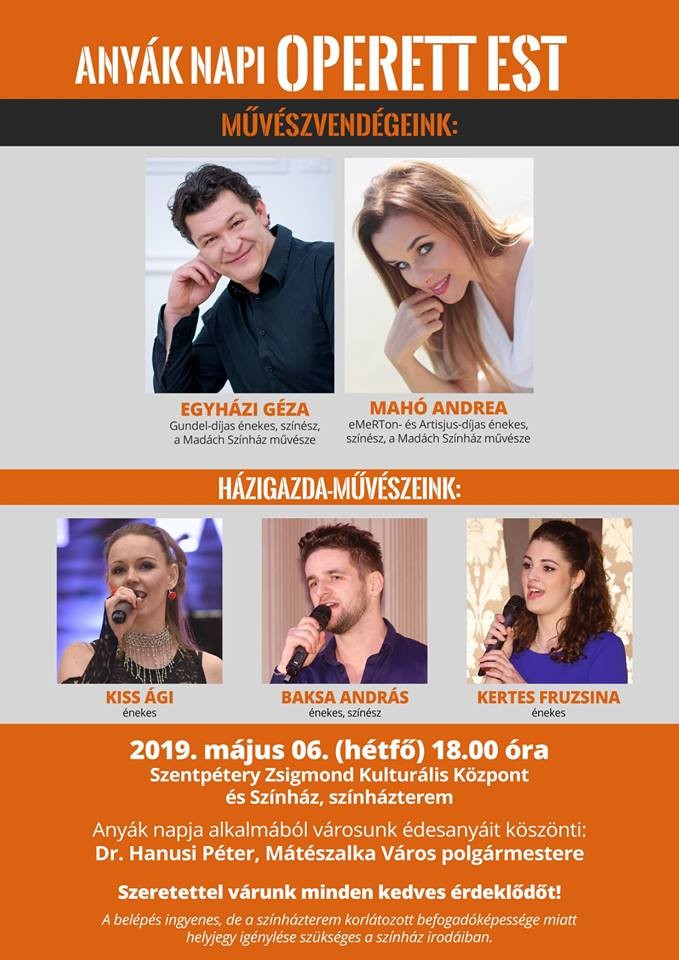 A város köszönti az édesanyákat Mátészalkán. Anyák napja alkalmából Mátészalka önkormányzata operett esttel ajándékozza meg az édesanyákat - írta közösségi oldalán a város polgármestere, Hanusi Péter. A műsor május 6-án (hétfőn) 18 órakor kezdődik a Szentpétery Zsigmond Kulturális Központ színháztermében. A rendezvény ingyenes, de a színházterem befogadóképességére tekintettel helyjegy foglalása szükséges.