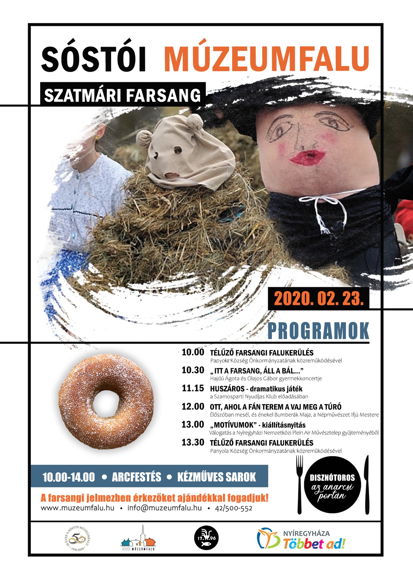 Február 23-án, vasárnap 10 órától különleges farsangi mulatságra várják az érdeklődőket a Sóstói Múzeumfaluban. A rendezvény visszarepít az időben, hiszen a régmúlt farsangját elevenítik majd fel. A program leglátványosabb része valószínűleg a lakóhelyük hagyományait hűen ápoló panyolai lakosok télűző farsangi falukerülése lesz. A farsangi jelmezben érkezők ajándékot kapnak.